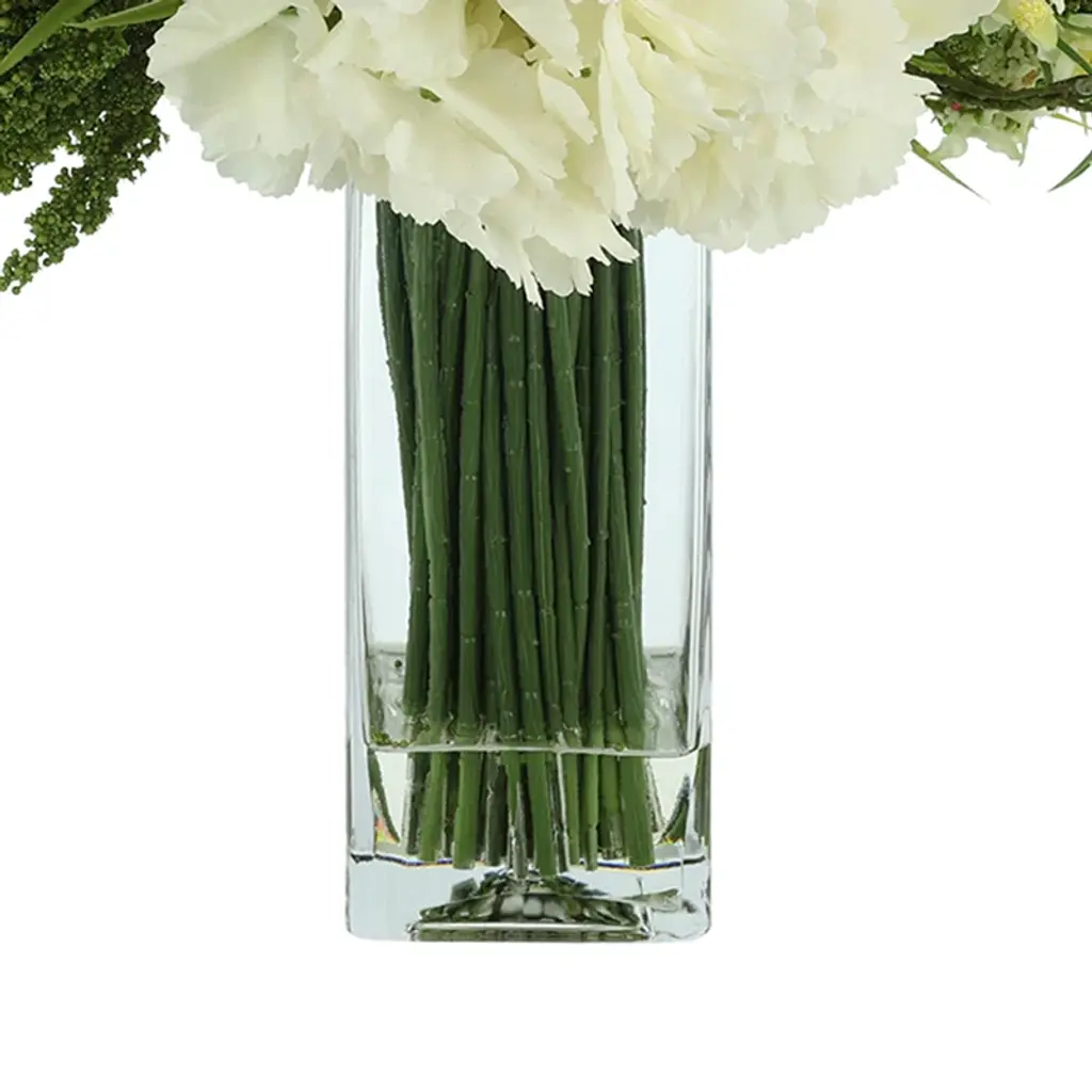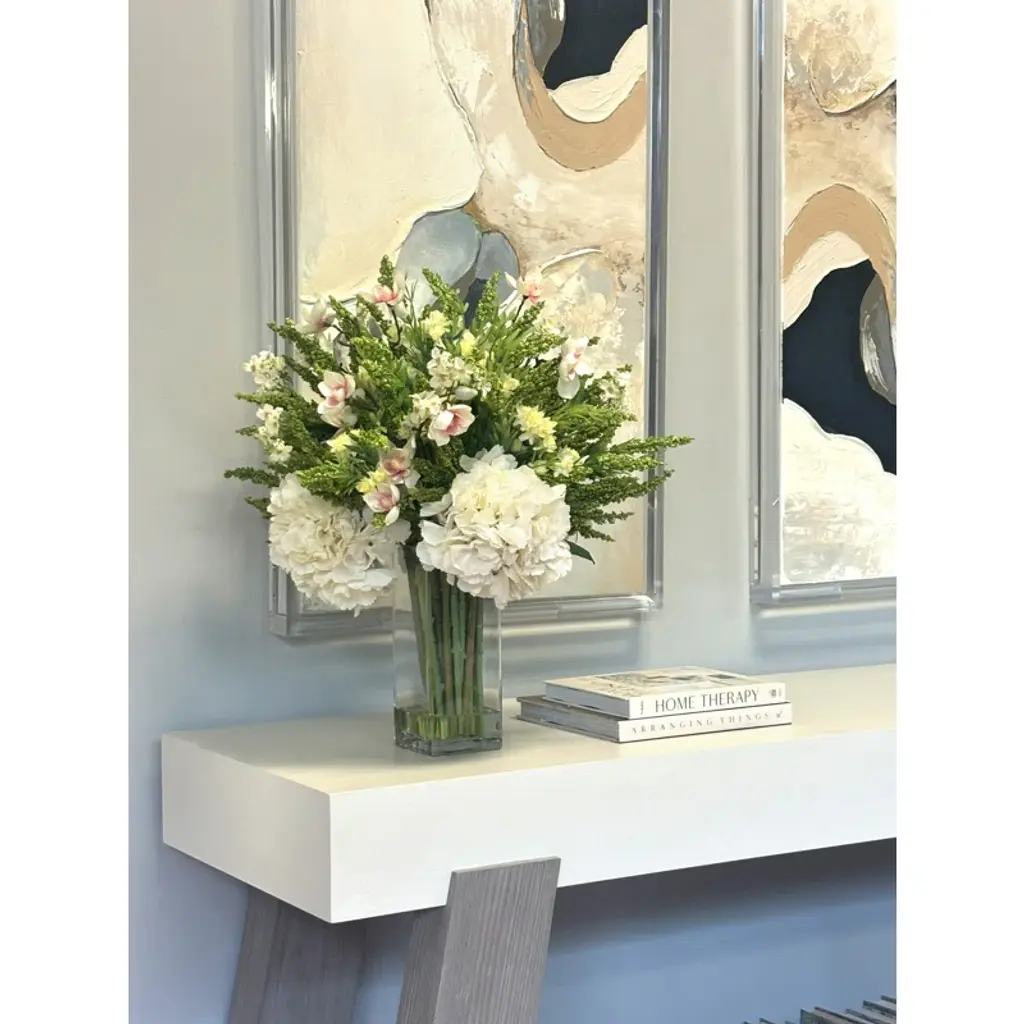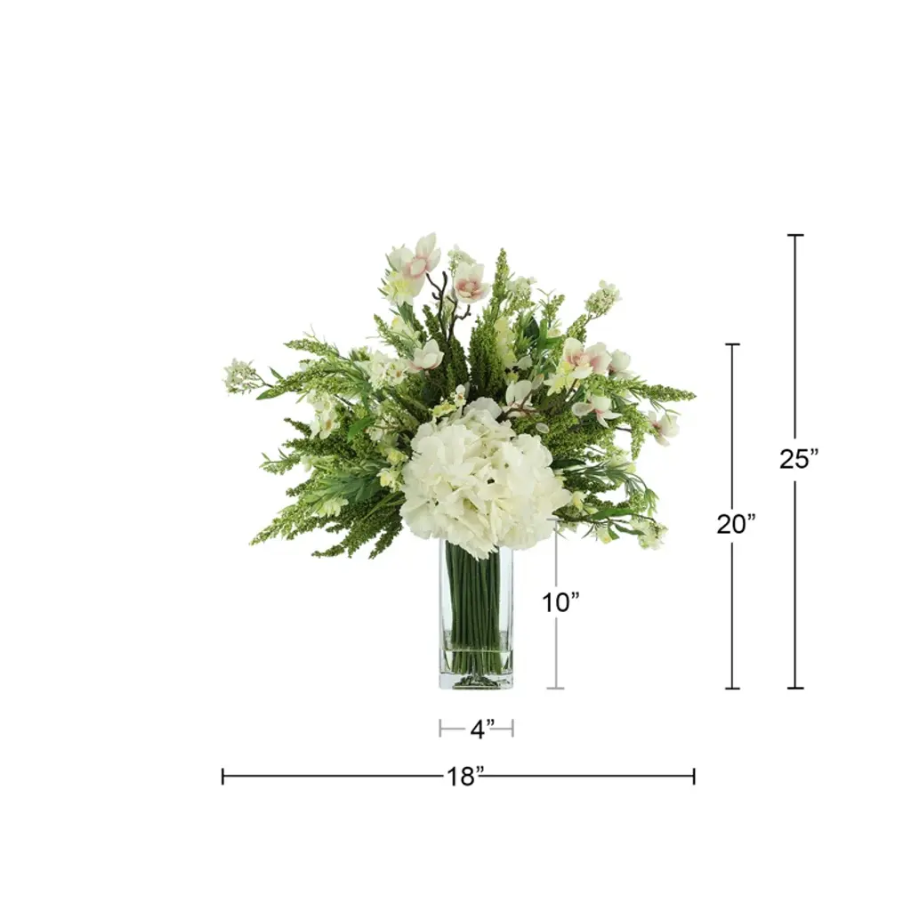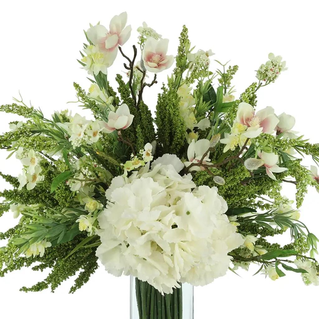 Transform any room into a botanical haven with this stunning faux floral arrangement. This classic piece features soft hydrangeas and cherry blossoms accented by butterfly magnolias and wild heather, all perfectly arranged in a tall clear glass vase. Whether you’re enhancing your home décor or giving someone special a lasting reminder of your affection, this charming mixed floral is the perfect addition to any space. This maintenance-free beauty can be enjoyed worry-free all year long.