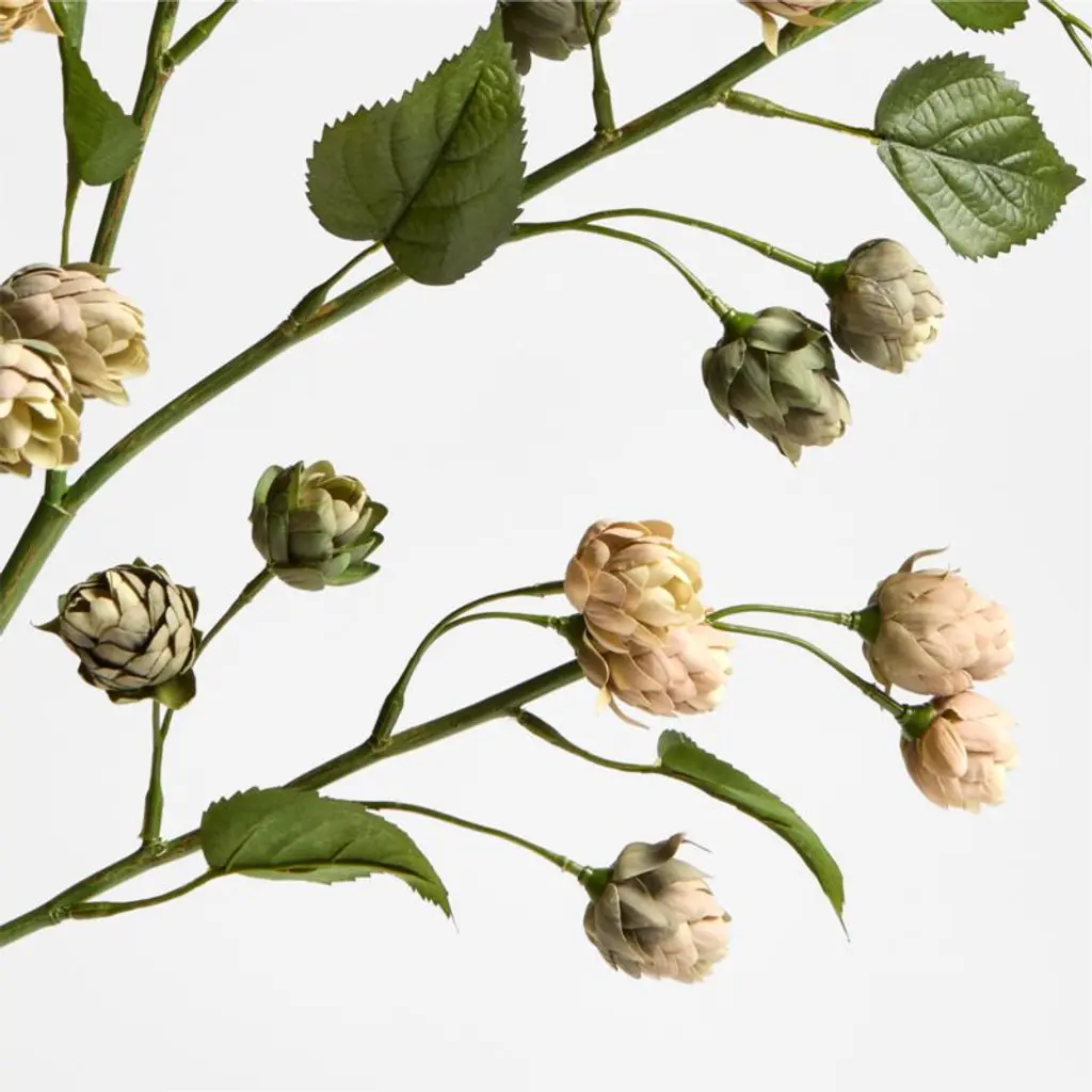 A prized beer-brewing ingredient, hops exhibit unexpected beauty captured by our faux spray. Dainty pinecone-like flowers adorn the tall stem, showing off delicate green, cream and blush hues. Unparalleled in quality and skillfully crafted to look just like the real thing, the charming spray looks fresh and effusive on its own or in multiples in one of our vases (sold separately).