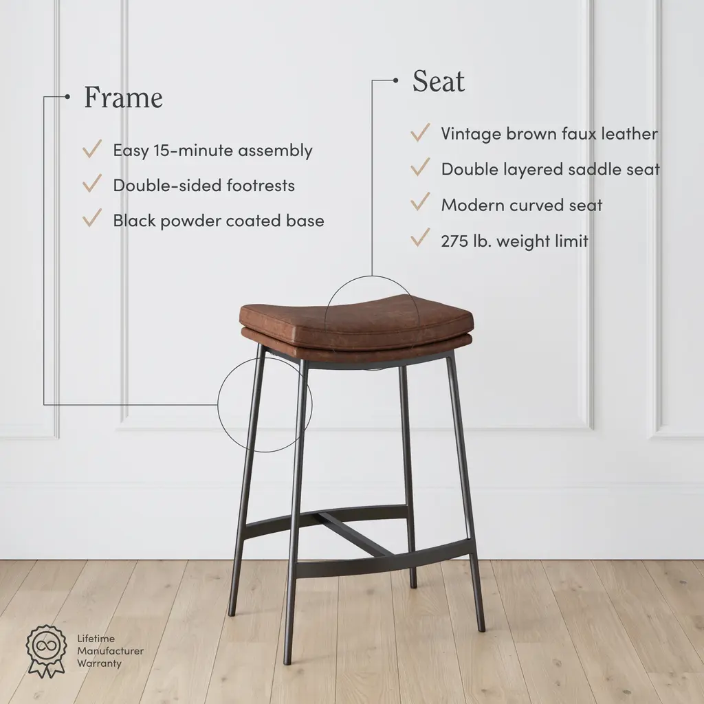 Rustic and modern all at the same time, the Arlo bar stool will bring out a level of sophistication to your kitchen island or breakfast nook you didn’t know existed. Its double layered saddle seat provides optimal comfort, while the perfectly placed footrests give you the perfect excuse to sip on that glass of rosé a little while longer. The curved vintage brown seat is supported by an airy black powder-coated base that is strong enough to hold you or the occasional napping cat (275 lbs or lighter, please!). The Arlo stool may be just the final touch to complete your modern farmhouse kitchen!