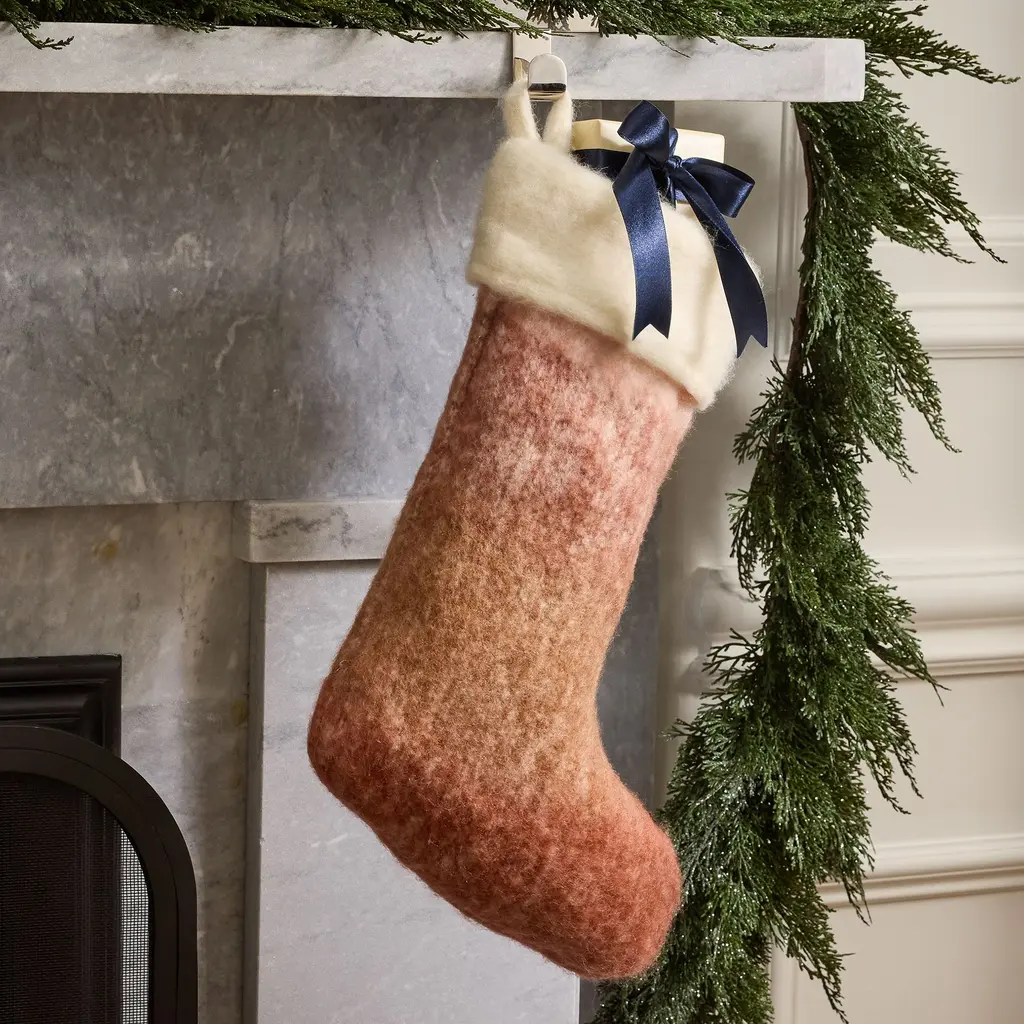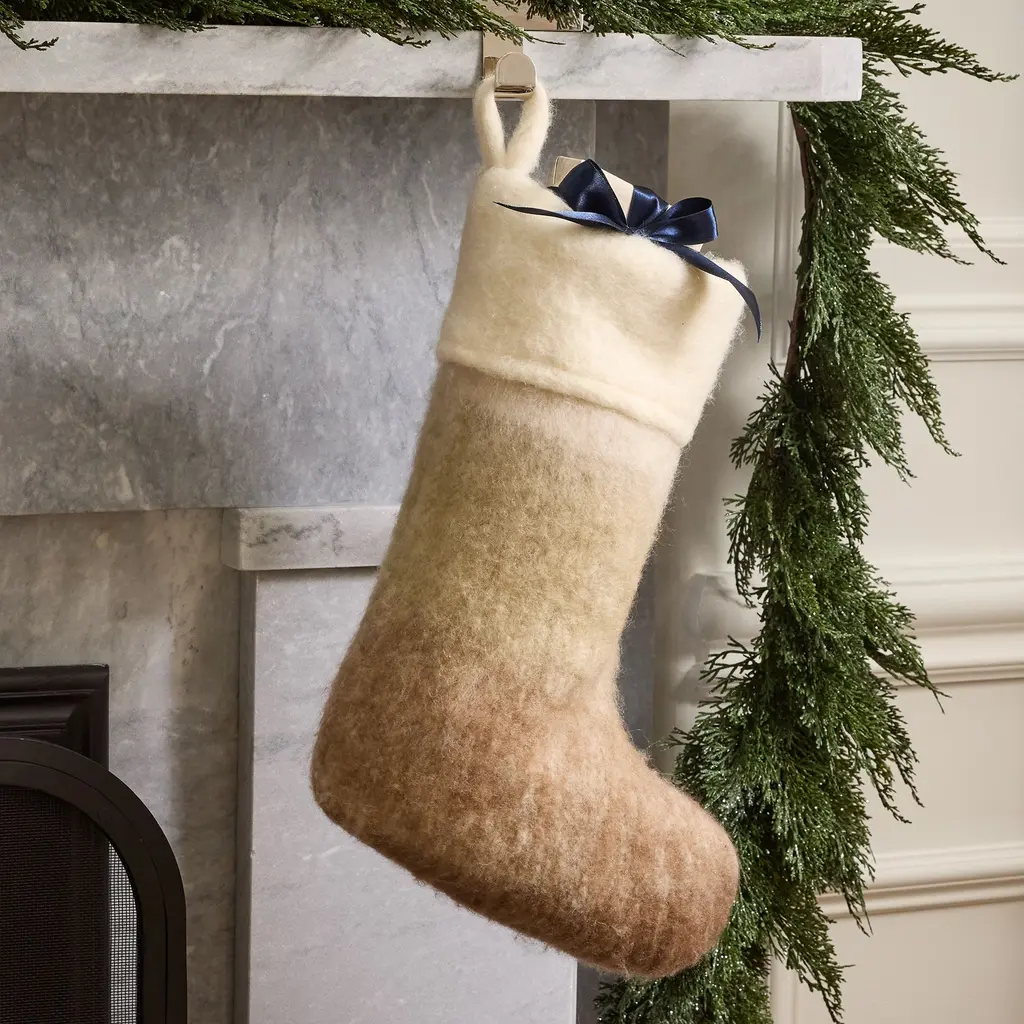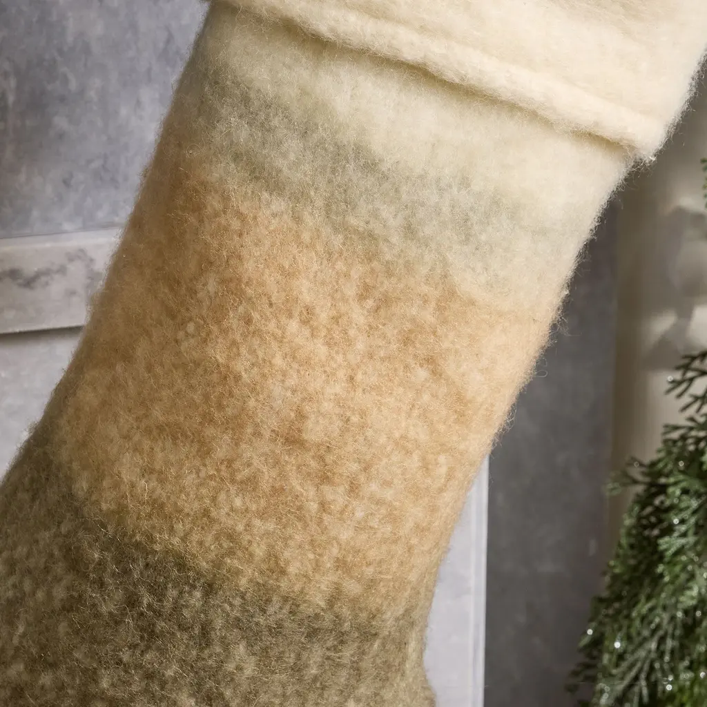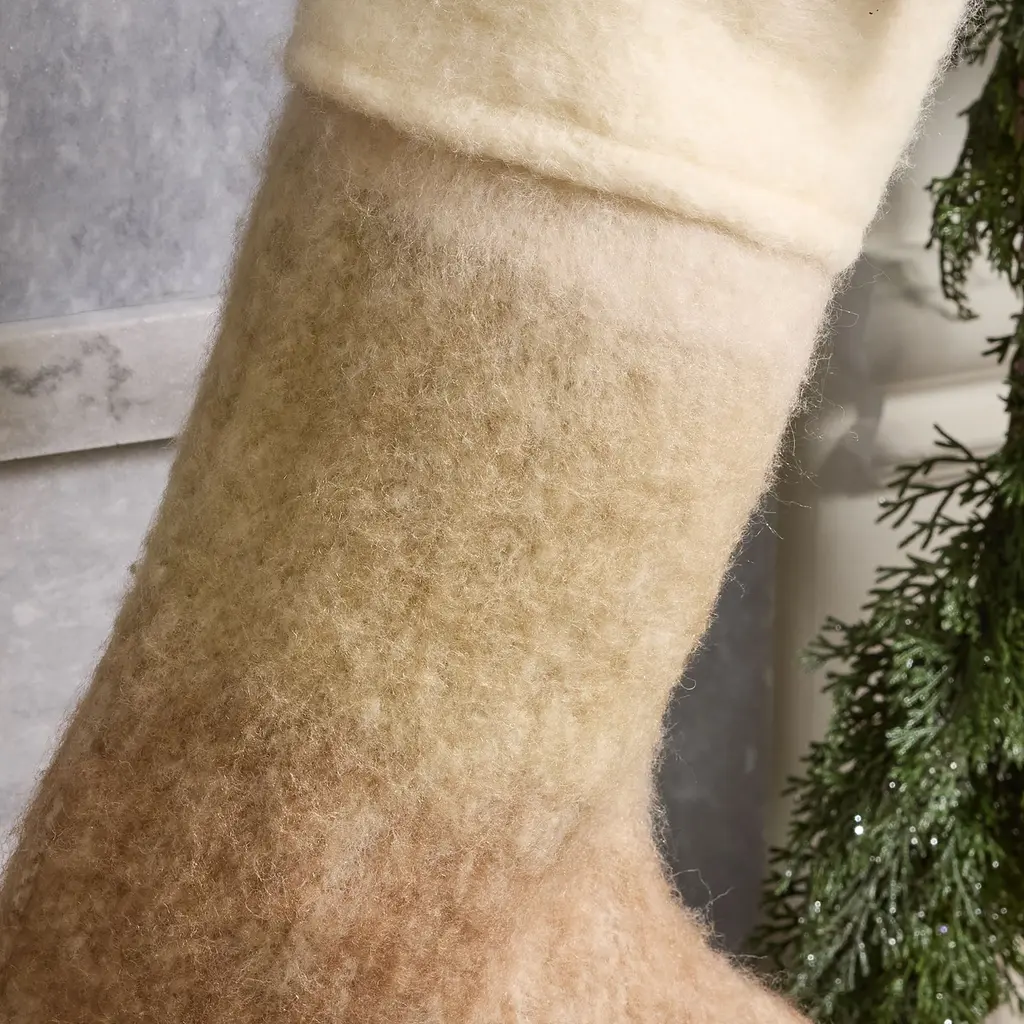 Soft as genuine mohair yet 100% faux. The subtle beauty of its ombre pattern. Brings seasonal charm to a mantel or stair rail. Perfect for stuffing with treats, treasures and cheer.