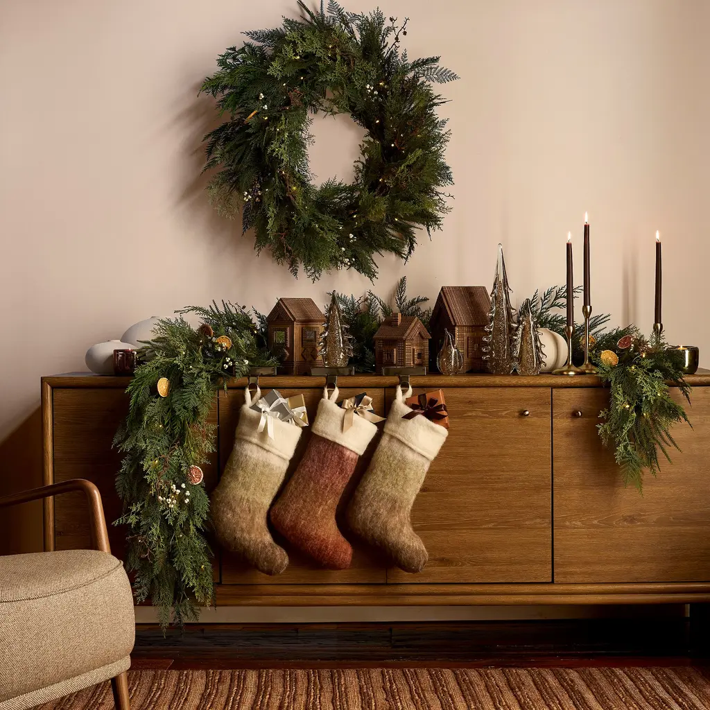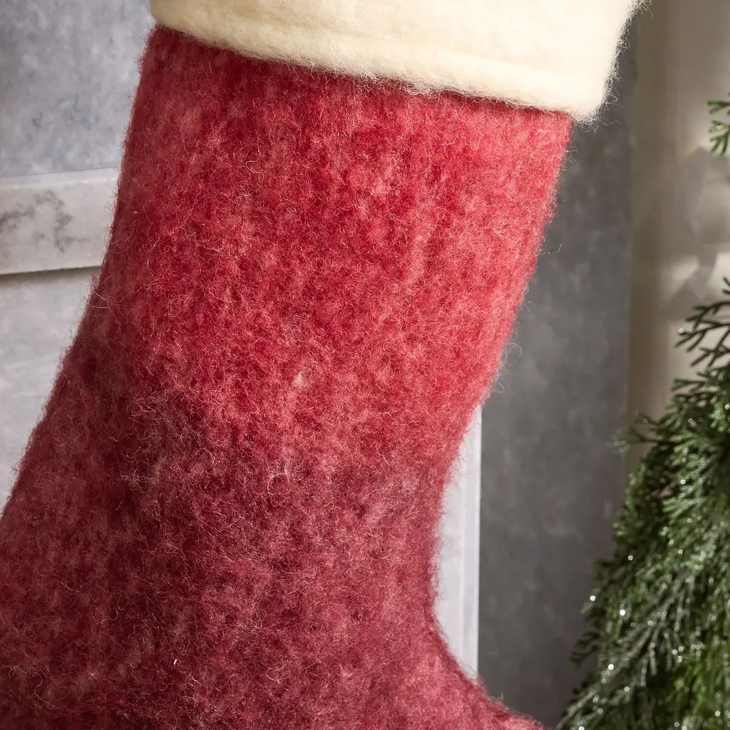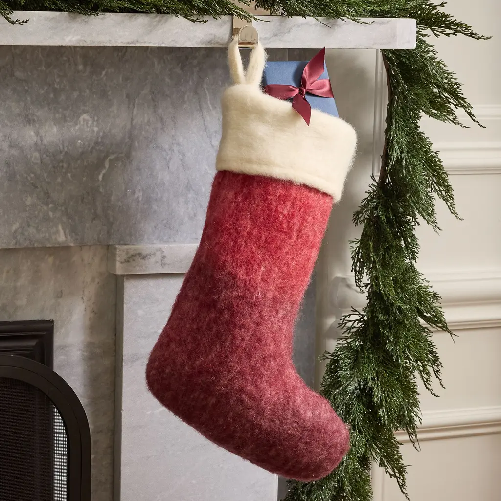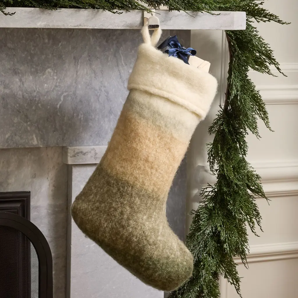 Soft as genuine mohair yet 100% faux. The subtle beauty of its ombre pattern. Brings seasonal charm to a mantel or stair rail. Perfect for stuffing with treats, treasures and cheer.