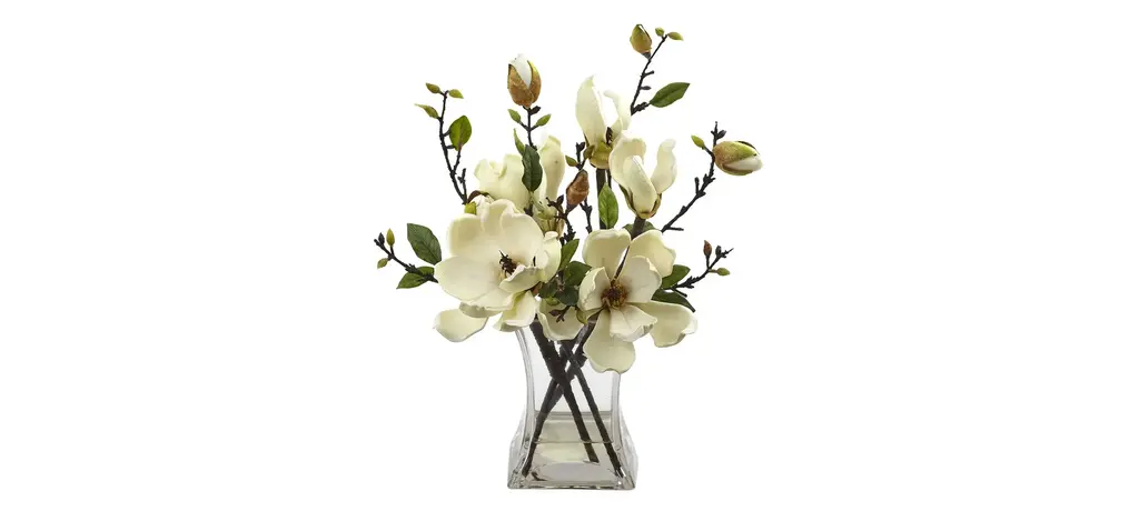 Infuse freshness into your living space with our stunning Faux Peach Blossoms. Arranged inside a simple glass vase, this bouquet exquisitely enhances any mantel or coffee table. Arrangement crafted from polyester, plastic, wire, and acrylic. Held in glass vase by faux water. Approximate dimensions include arrangement.
