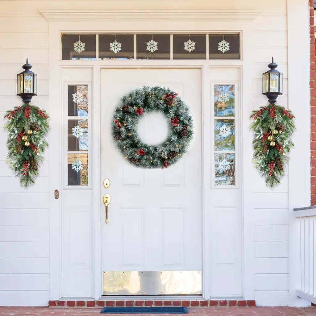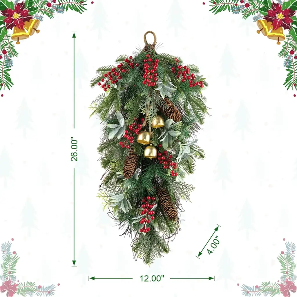 A Harry & David Top Holiday Pick. This frosted pine teardrop door swag is made of high quality plastic artificial green pine neddles branches, red foam berries fruits, bells and natural pinecones, durable and not easy to fade. There is a ring of the pendant for easy hanging. This exquisite handmade wreath combines green and red of the four seasons to give your door trim a new look. No need to dry branches or clean up loose needles. Its typical and classic design will totally attract your guests and make your home/parties/stores with full of warm and romantic atmosphere.