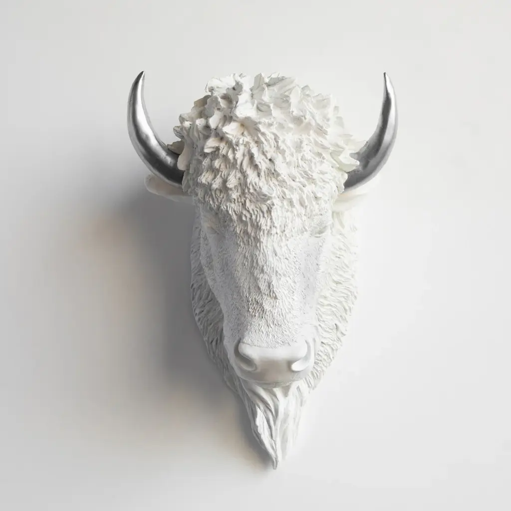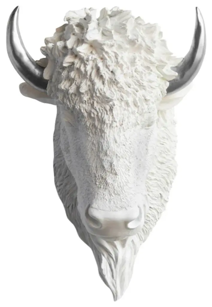 Faux Taxidermy Bison Head Wall Mount, White And Silver