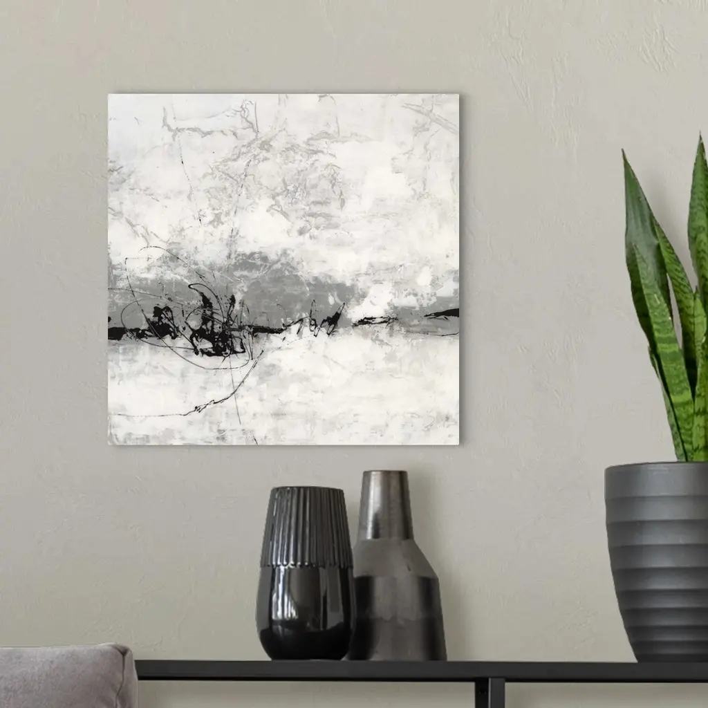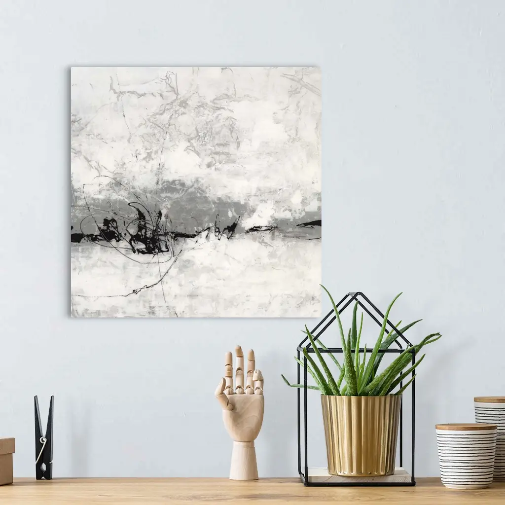 Abstract art of thin swirling lines of black and grey paint on a roughly brushed light background.