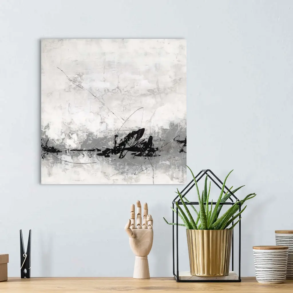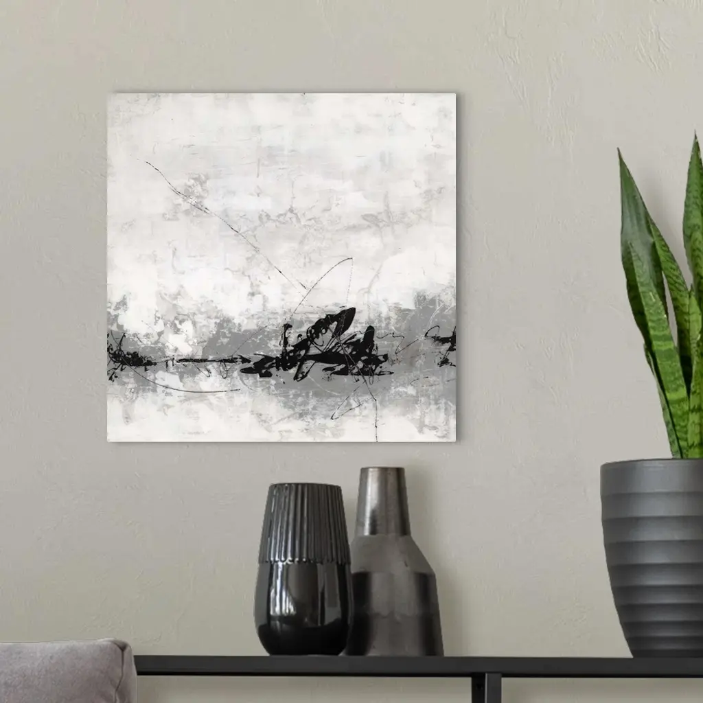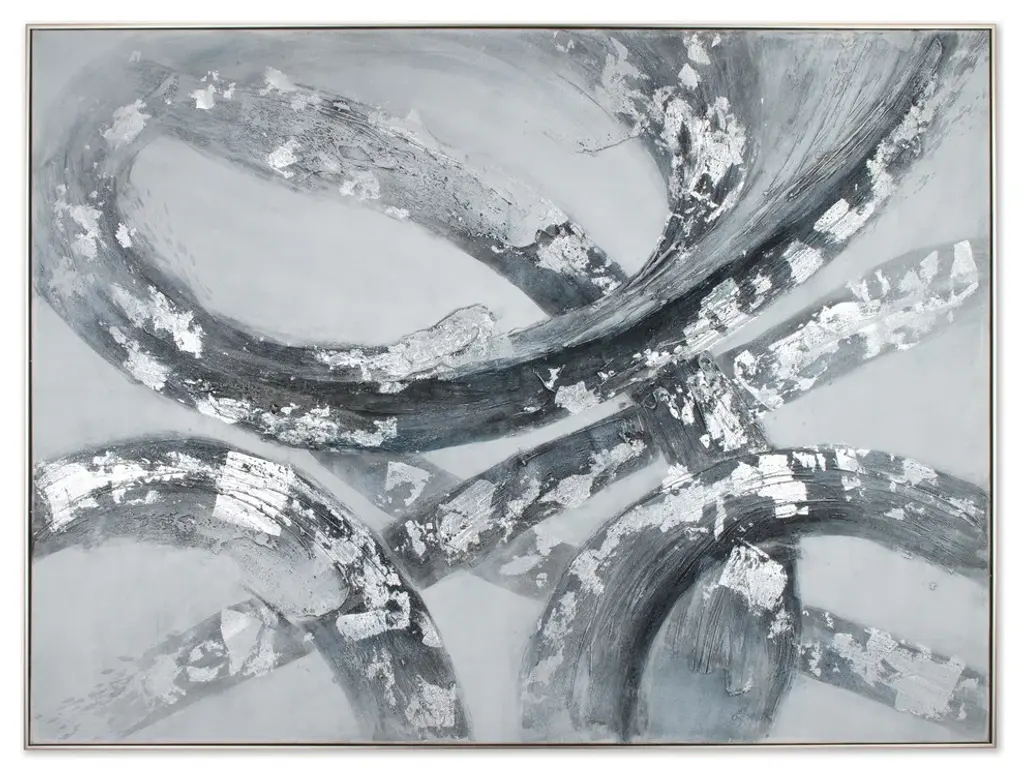 Abstract art of thin swirling lines of black and grey paint on a roughly brushed light background.