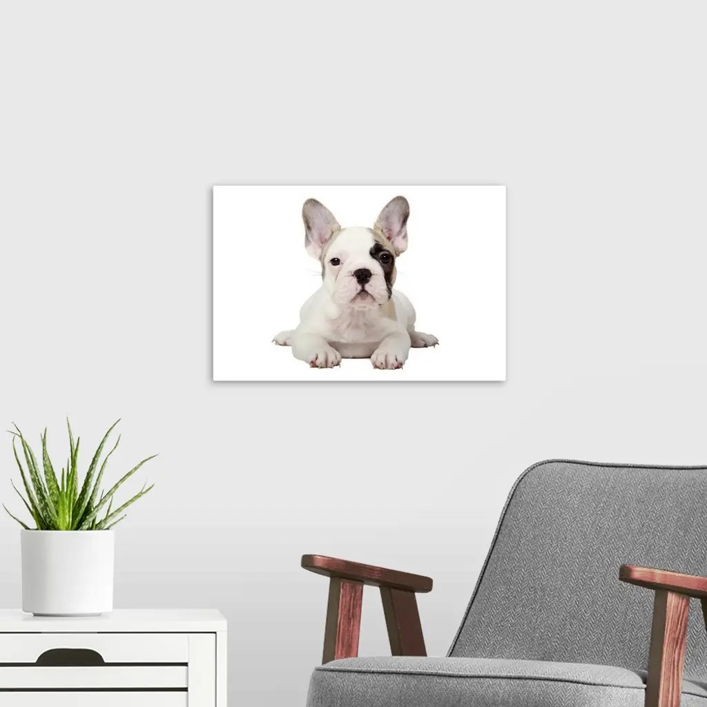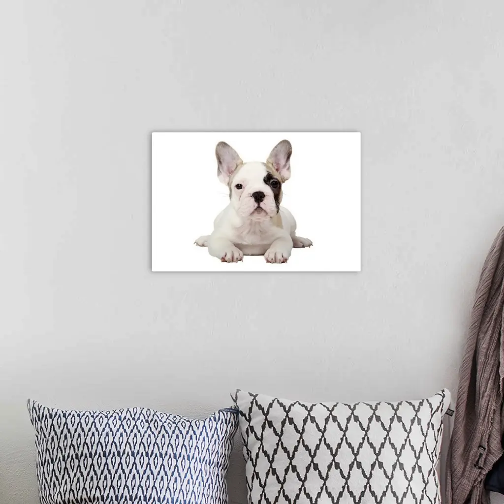Fawn Pied French Bulldog puppy on white background. wall art for home and office decor. Discover canvas art prints, photos, mural, big canvas art and framed wall art in GreatBigCanvas.com's varied collections.