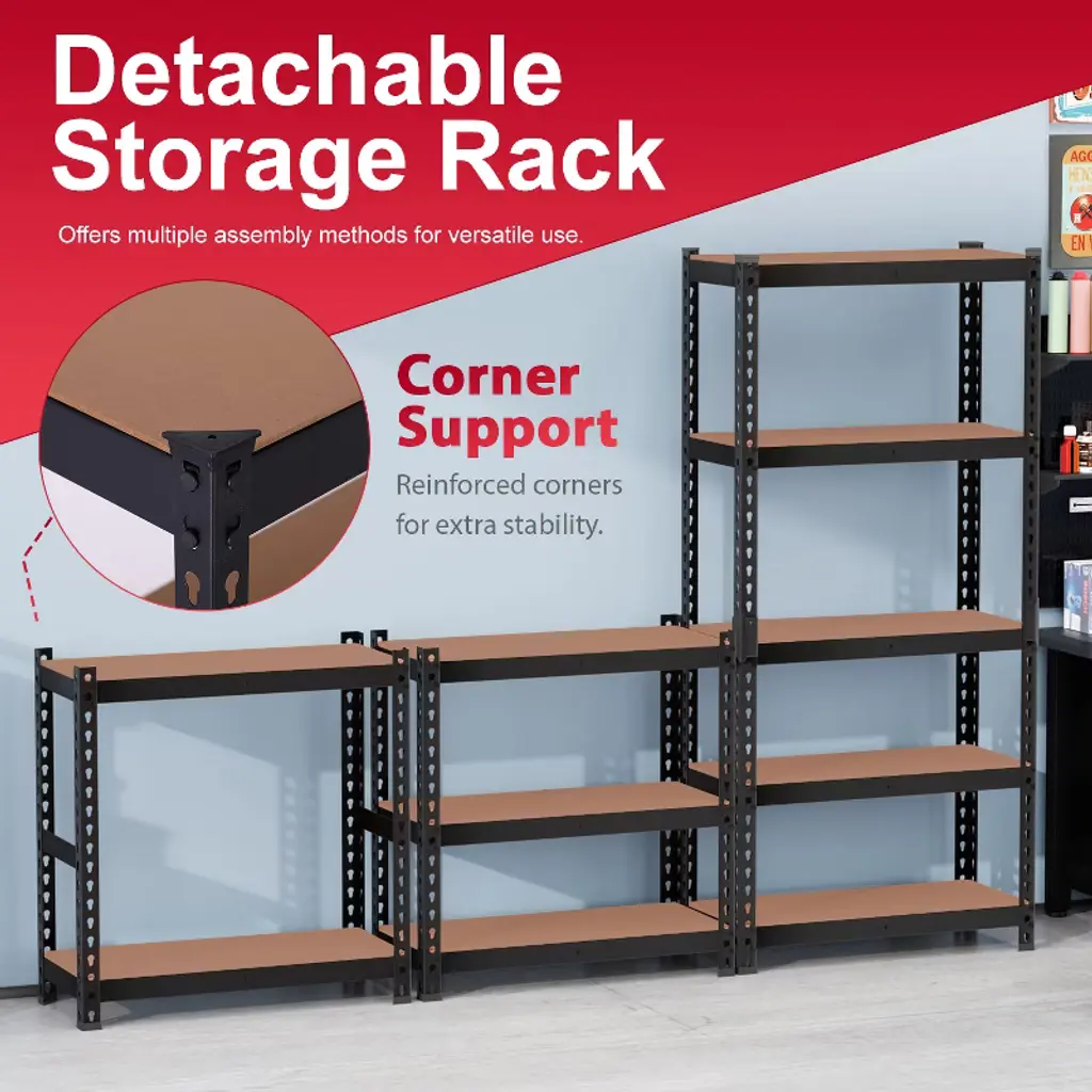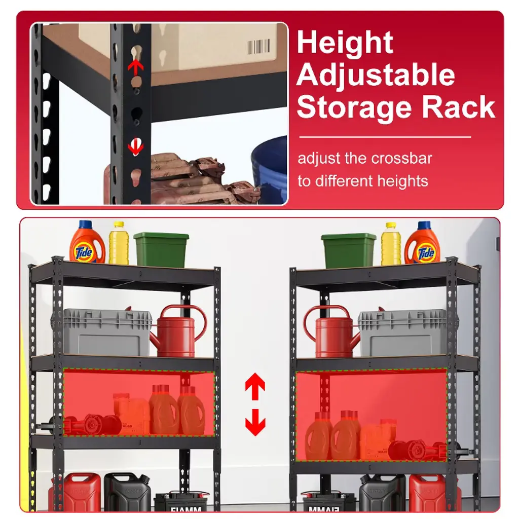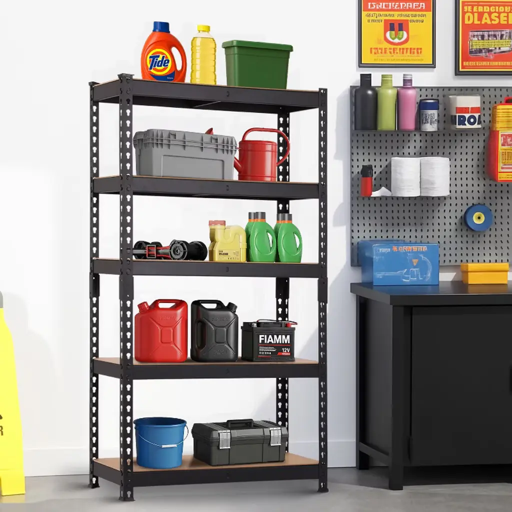 FDW Multi-functional adjustable heavy-duty Metal storage rack (5-layer load-bearing design) This five-layer Metal storage rack features a high-strength black frame combined with light brown panels, balancing industrial durability with home practicality. Its core advantage lies in the height-adjustable design, which allows for flexible changes in layer spacing through side holes, suitable for items of different heights such as oil drums and storage boxes.
