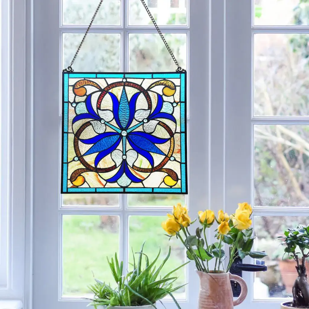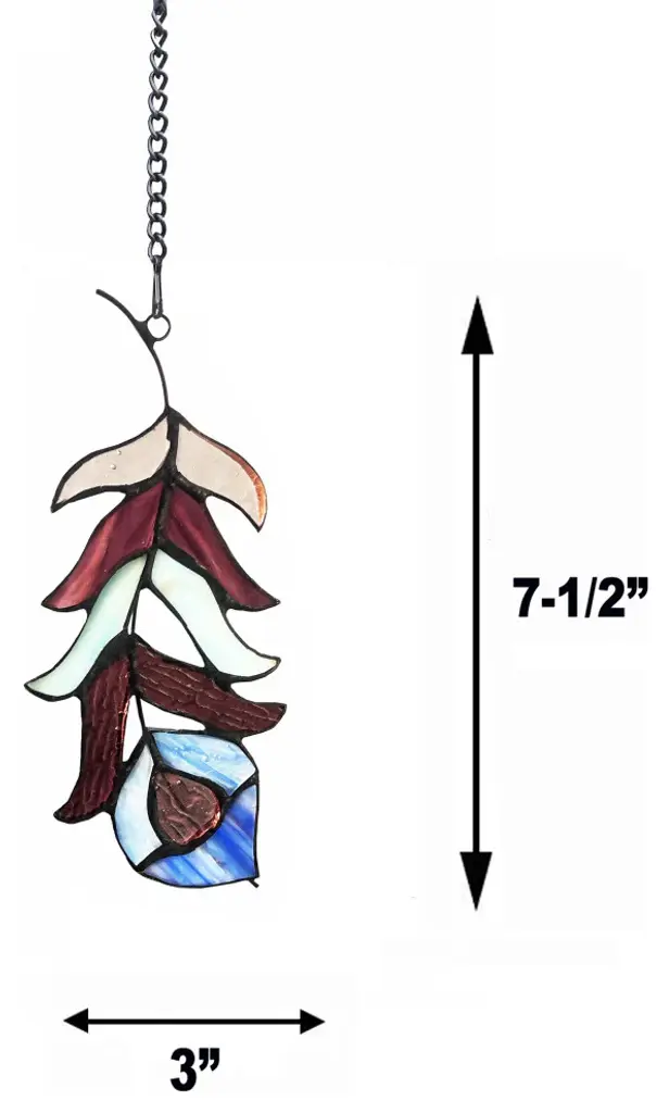 This is a beautifully designed feather window panel using tiffany stained glass. This piece is made up of 12 total pieces of hand cut, stained art glass, expertly pieced and soldered together to create each panel. Each of CHLOE''s Tiffany-style stained glass panels are formed using the very same technique developed by Louis Comfort Tiffany in the early 1900''s, using hand cut stained art glass, each wrapped in fine copper foil and soldered together at extremely high temperatures to form each unique panels. Exact size to the nearest inch may vary, and exact color of each glass piece may vary due to each piece being hand crafted. First image is with the light shining through, second image is with no light.