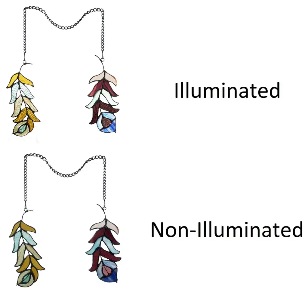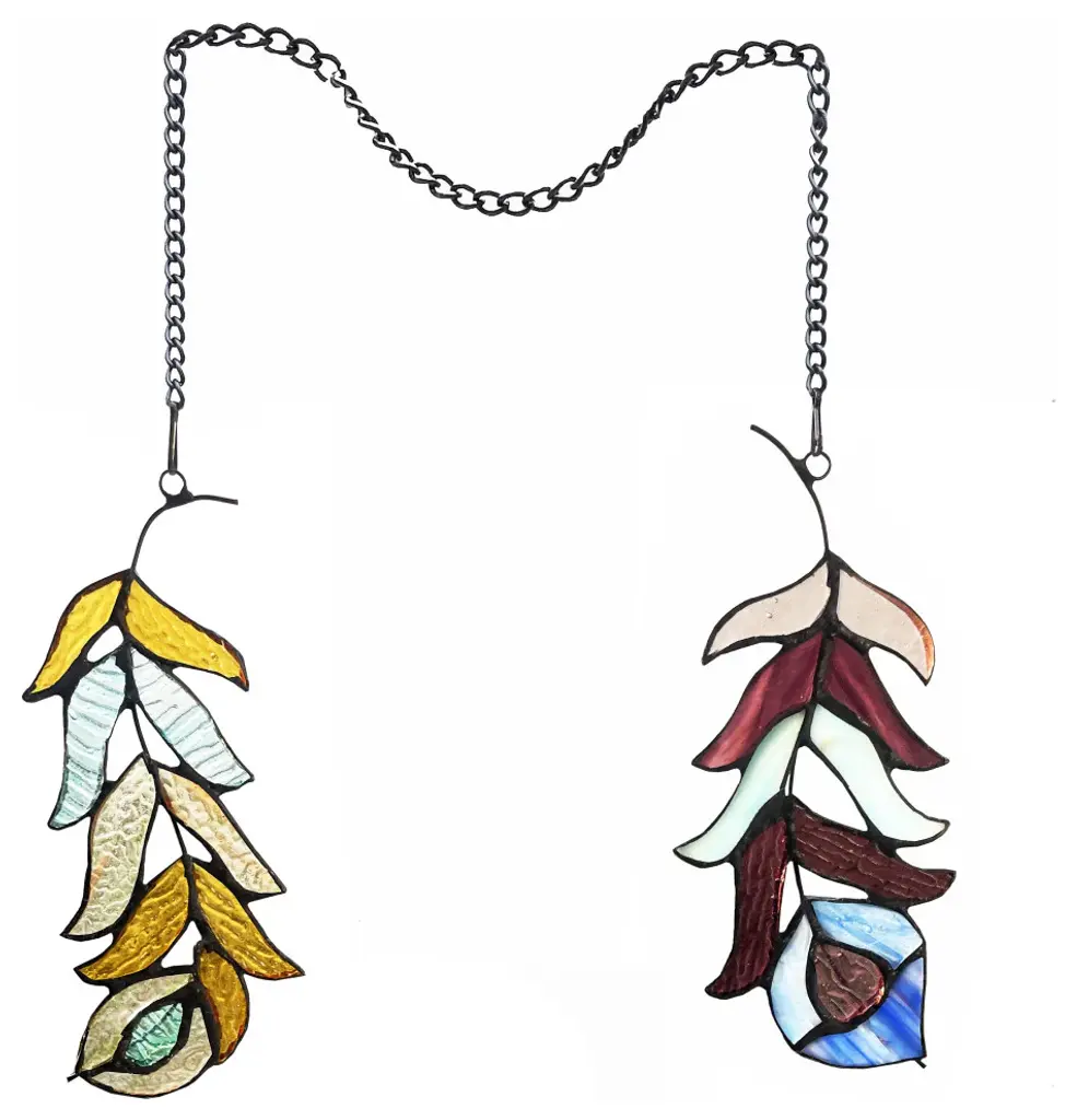 This is a beautifully designed double feather window panel using tiffany stained glass. These pieces are made up of 25 total pieces of hand cut, stained art glass, expertly pieced and soldered together to create each panel. Each of CHLOE''s Tiffany-style stained glass panels are formed using the very same technique developed by Louis Comfort Tiffany in the early 1900''s, using hand cut stained art glass, each wrapped in fine copper foil and soldered together at extremely high temperatures to form each unique panels. Exact size to the nearest inch may vary, and exact color of each glass piece may vary due to each piece being hand crafted. First image is with the light shining through, second image is with no light.