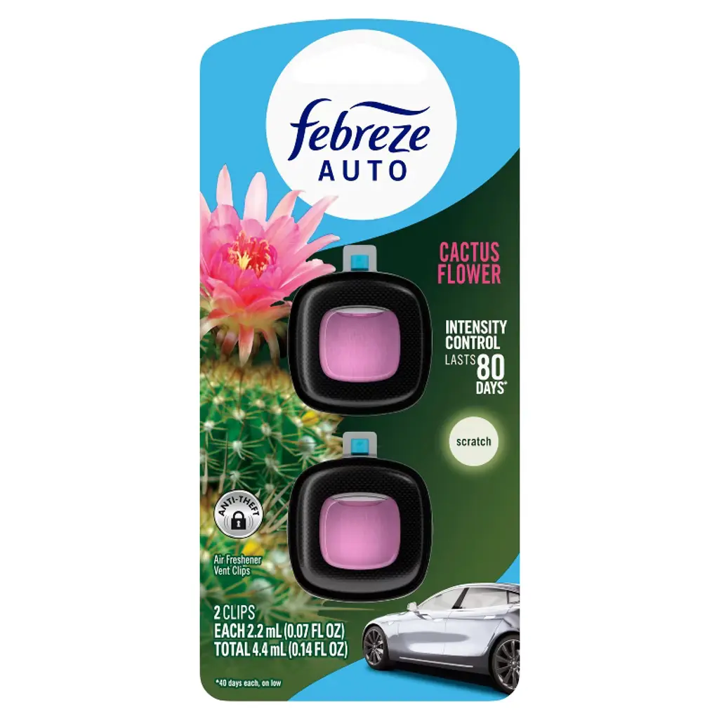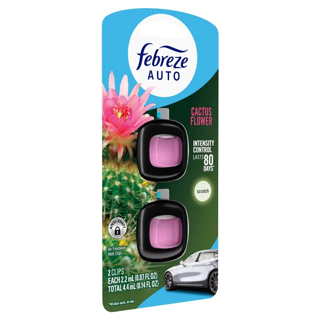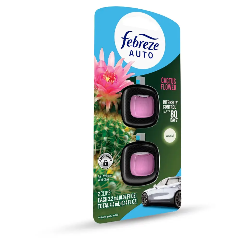 Kick car odors to the curb and enjoy up to 40 days of consistent scent with Febreze AUTO. While other car refreshers start off like a floral punch in the face, Febreze smells just right, right away. You'll get that first-day Febreze fresh for up to 40 days courtesy of its patented Steady Release Technology. This car air freshener vent clip is a breeze to install: Just unfold the clip until you hear a click, then clip it to your vent. It uses your car's fan to circulate an even scent through your entire vehicle. These tiny car deodorizers are made with odor fighters that fight any car stink with a scent that lasts. So forget those overwhelming, fade-too-soon fresheners and enhance every drive with the long-lasting freshness of Febreze AUTO. Want a fresh that lasts at home, too? Try Febreze Fade Defy PLUG.