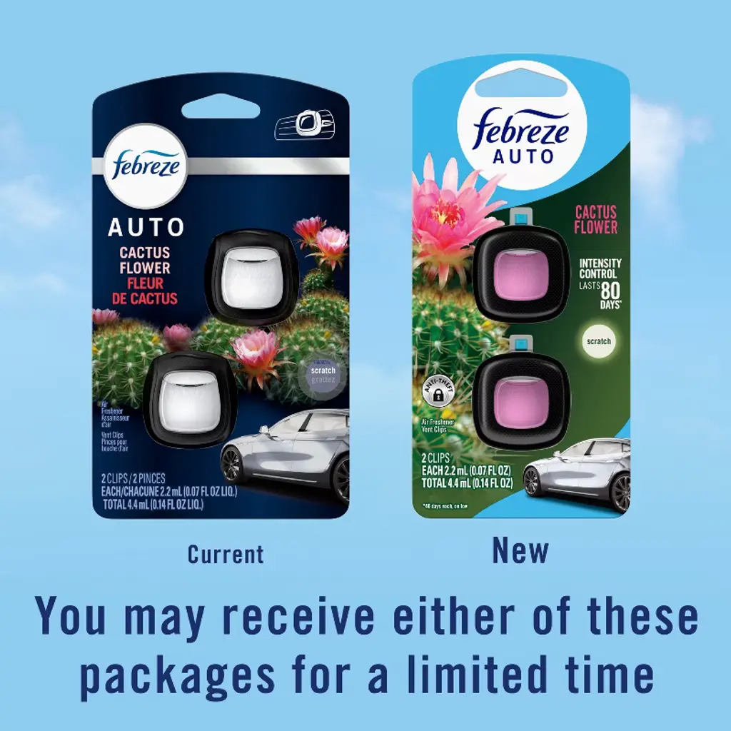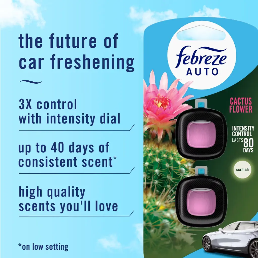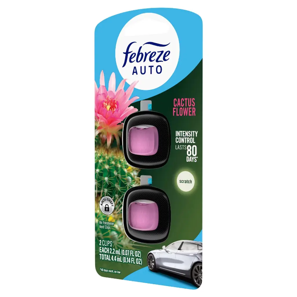 Kick car odors to the curb and enjoy up to 40 days of consistent scent with Febreze AUTO. While other car refreshers start off like a floral punch in the face, Febreze smells just right, right away. You'll get that first-day Febreze fresh for up to 40 days courtesy of its patented Steady Release Technology. This car air freshener vent clip is a breeze to install: Just unfold the clip until you hear a click, then clip it to your vent. It uses your car's fan to circulate an even scent through your entire vehicle. These tiny car deodorizers are made with odor fighters that fight any car stink with a scent that lasts. So forget those overwhelming, fade-too-soon fresheners and enhance every drive with the long-lasting freshness of Febreze AUTO. Want a fresh that lasts at home, too? Try Febreze Fade Defy PLUG.