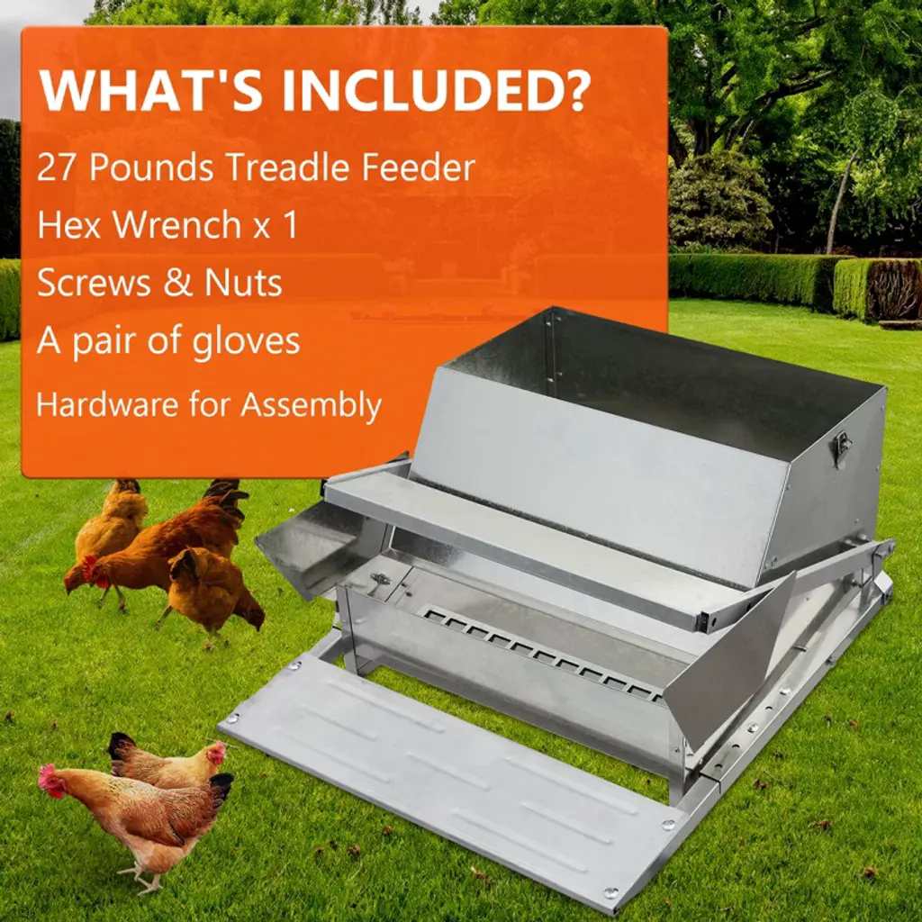 Heavy-Duty Galvanized Steel Chicken Feeder with Treadle – 27LB Capacity, Automatically Reduces Feed Waste & Keeps Rodents OutThis professional-grade treadle chicken feeder combines superior durability with smart pest-proof engineering, ensuring your flock gets fresh, dry feed while preventing rats, wild birds, and squirrels from stealing meals. The step-activated design trains chickens quickly while conserving up to 40% more feed than traditional feeders.KEY FEATURESFEED PROTECTIONGalvanized steel construction – Rust-proof, chew-proof, and UV-resistantSealed treadle lid – Only opens when chickens step on the platformDeep feed reservoir – Holds 27 lbs (enough for 10 chickens × 11 days)DESIGNED FOR ALL POULTRYAdjustable sensitivity – Works for bantams, ducks, and pheasantsLow-step entry – Easy for young/small birds to activateWide feeding tray – Allows 4 birds to eat simultaneouslySMART ENGINEERINGAnti-spill edges – Prevents scratching wasteRemovable rain cover – Keeps feed dry in wet weatherQuick-clean design – Fully disassembles in seconds