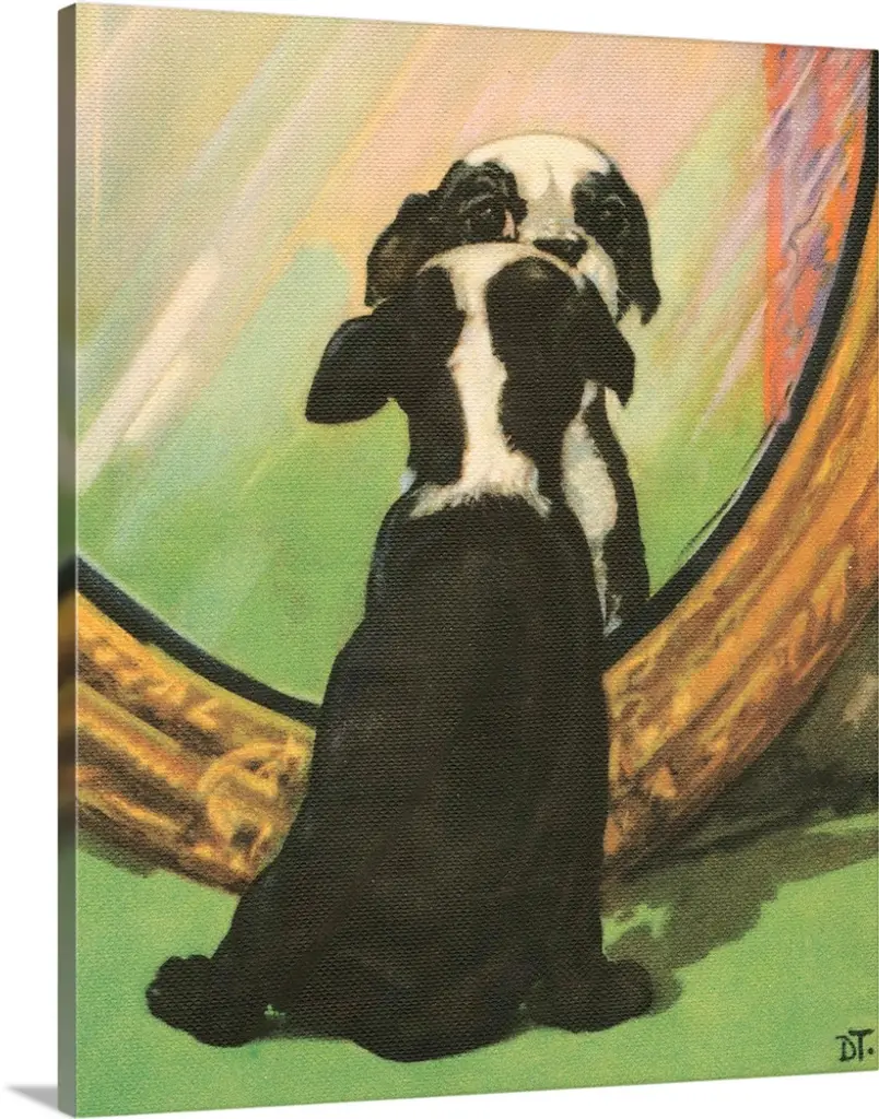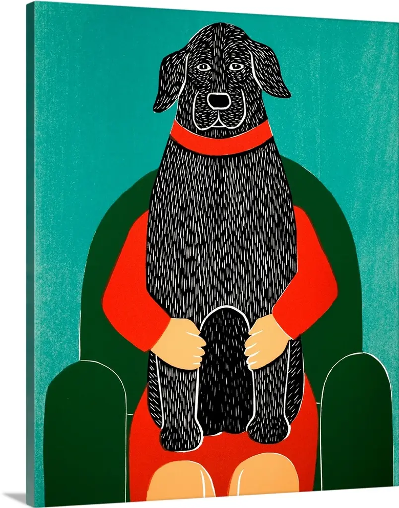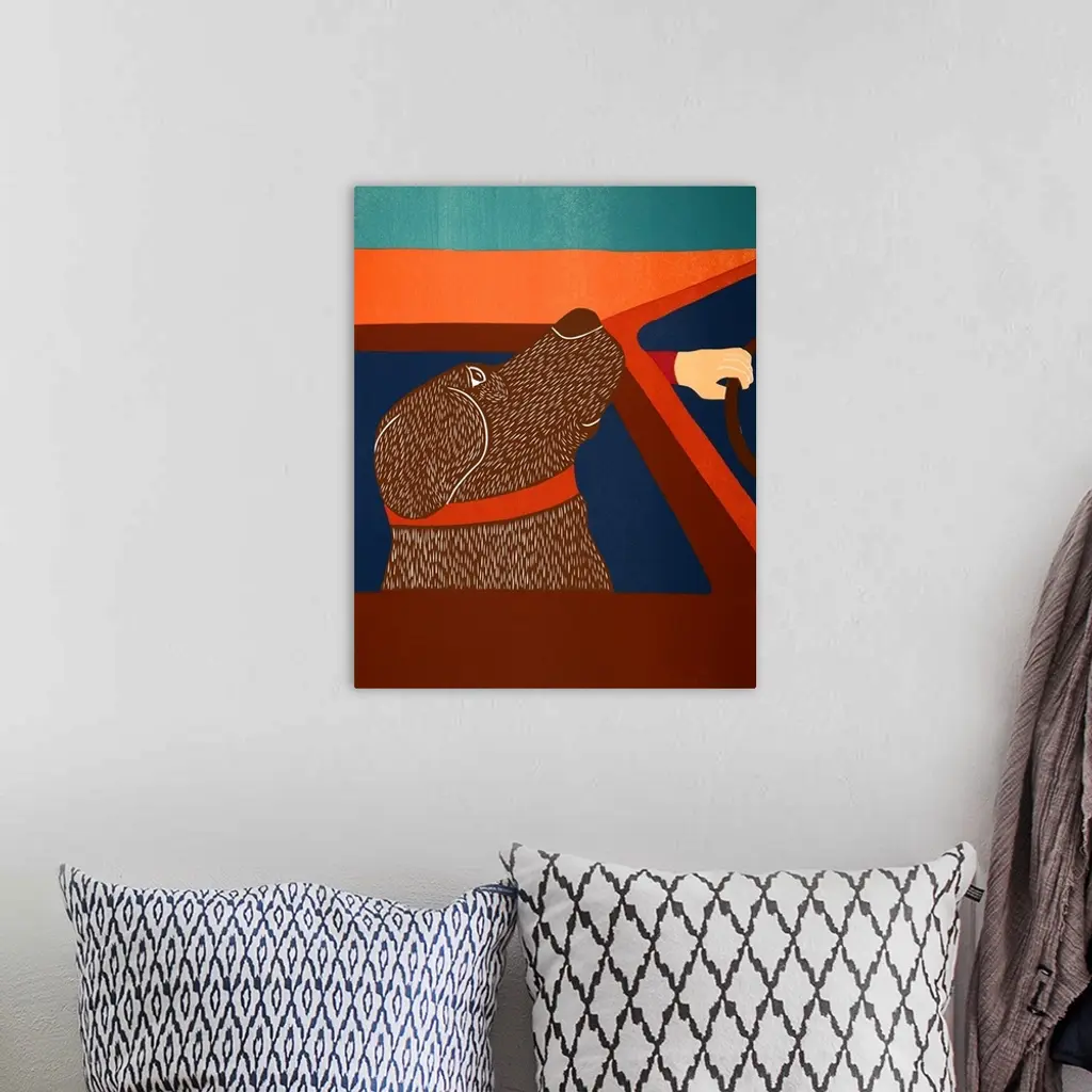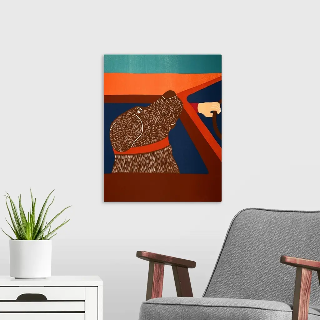 Illustration of a chocolate lab riding in a car with its head out of the window.
