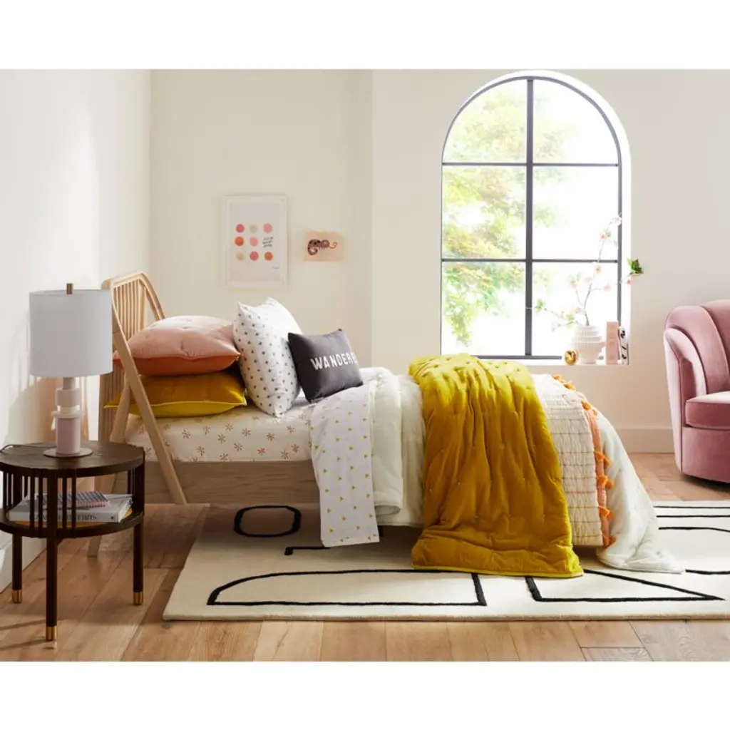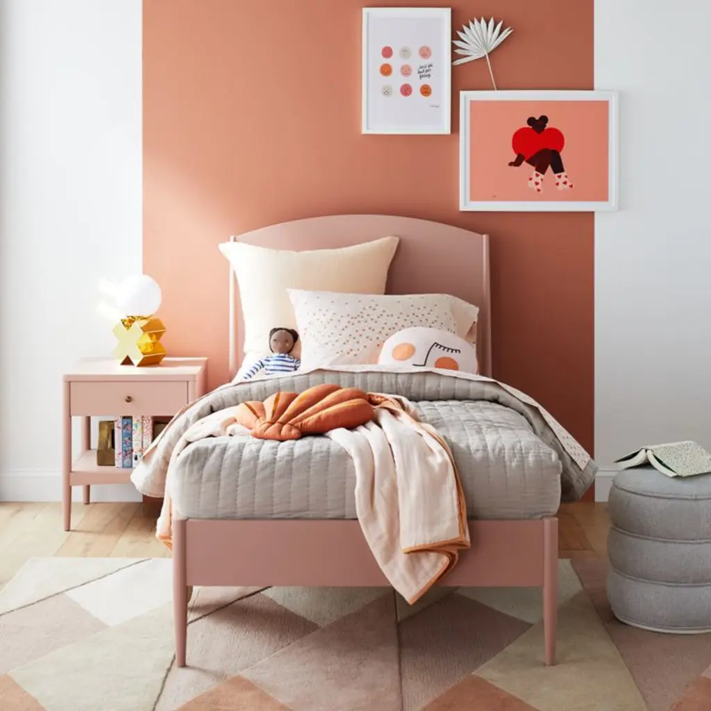 This unique wall art reminds kids to express themselves, no matter how they're feeling. It features happy faces and sad faces, silly ones and surprised ones, plus the phrase "don't feel bad for feeling" in a playful cursive font. With soft blush, orange, beige and rose hues, it brings dreamy color pops (and an encouraging message) to kids rooms.