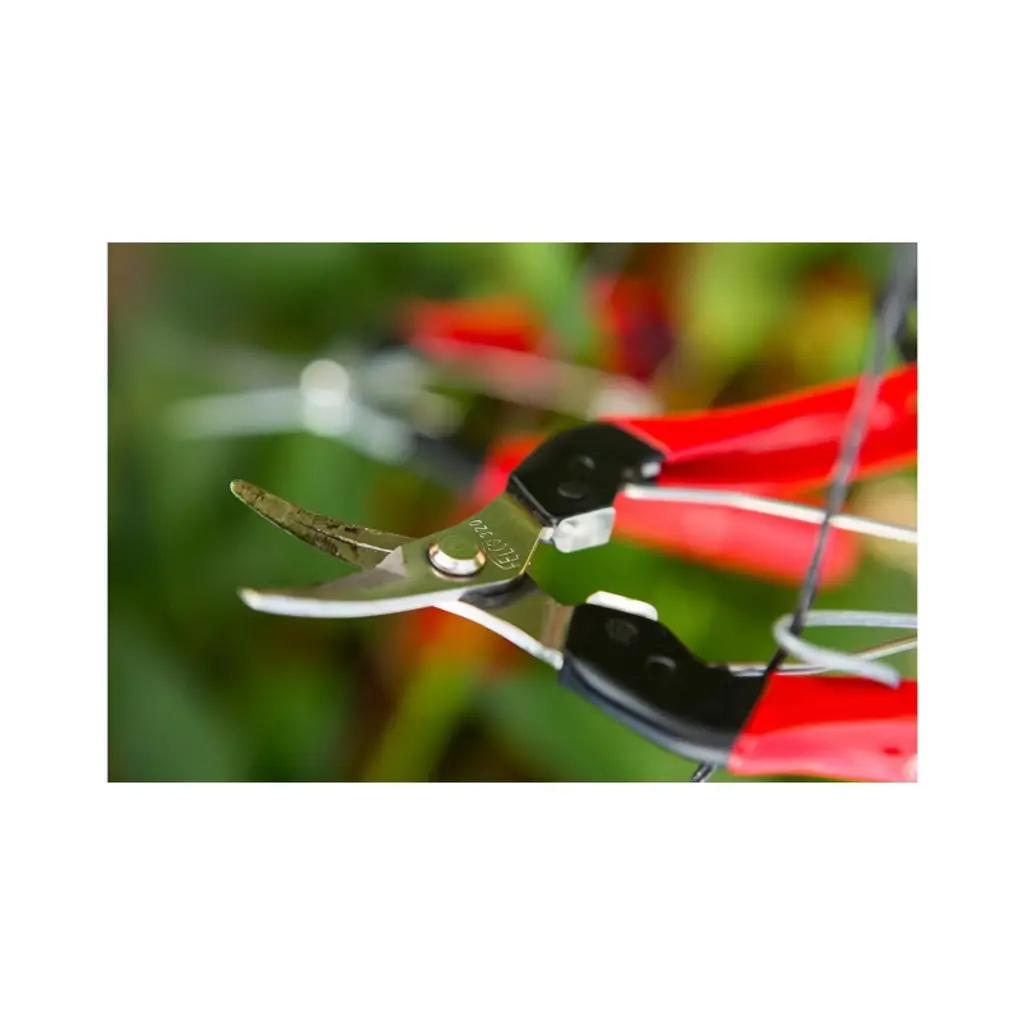 Compact and extremely manoeuvrable, FELCO 320 picking and trimming snips have a curved blade for cutting the stalks of fruit, vegetables and flowers without damaging them as the blade curves away. These picking and trimming snips are essential companions while harvesting or trimming, and also have soft polyurethane shock absorbers that make work painless and reduce muscle tension. Their carbon steel blades are nickel plated to protect them from corrosion and smooth cutting.