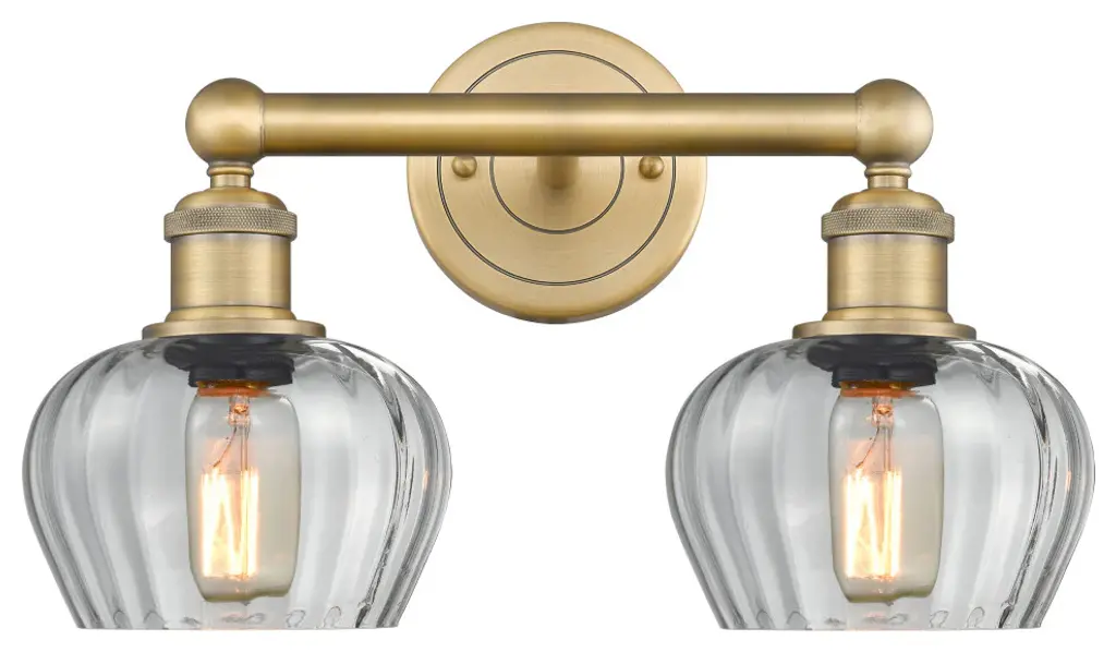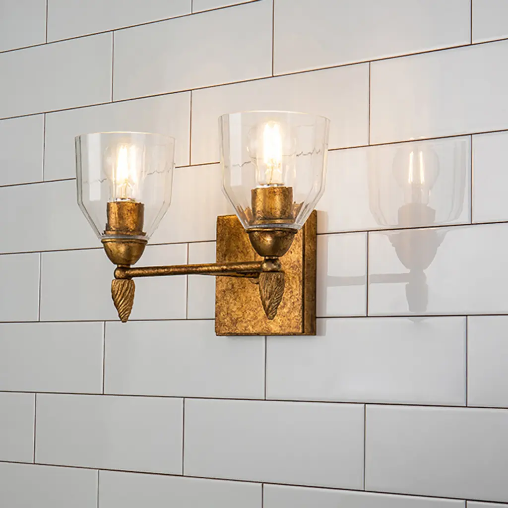 Drawing inspiration from a classic design, this distressed gold 2-light vanity light is the perfect pick for any contemporary or traditional space. This Felice design showcases a simple, rectangular 5" square backplate, dome shaped glass shade, and a decorative unique acorn-shaped gold finial. Easily installed over your mirror, this two-light sconce is suitable for damp spaces, and is finished in a beautiful antique gold