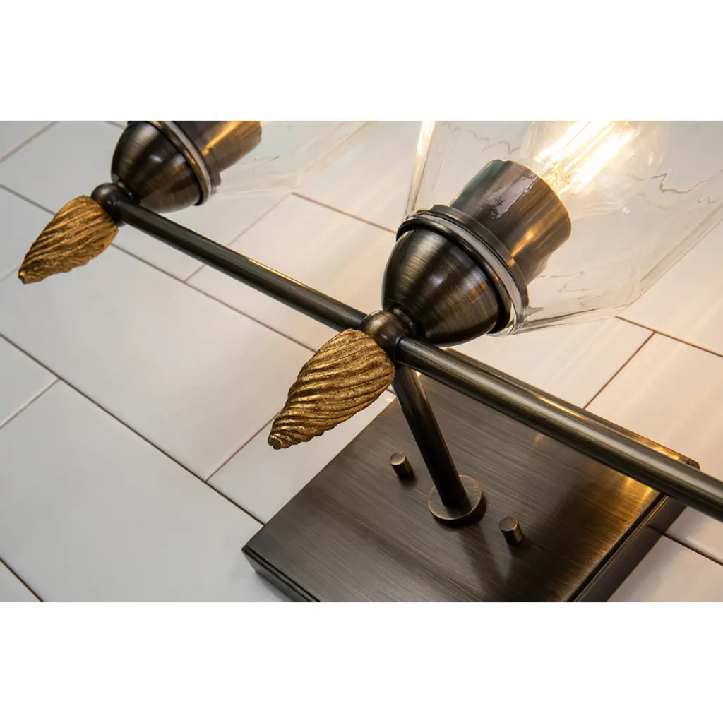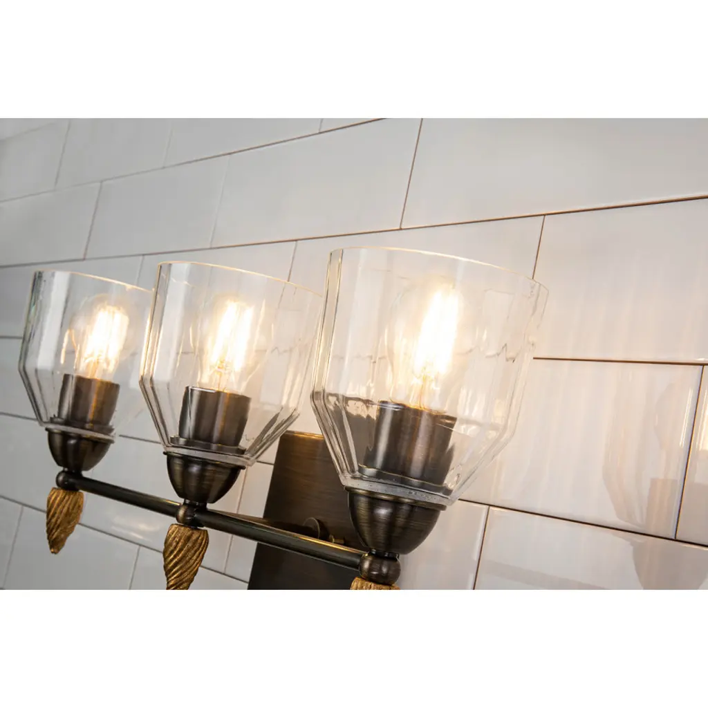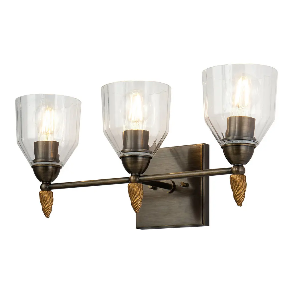 Drawing inspiration from a classic design, this black and gold 3-light vanity light is the perfect pick for any contemporary or traditional space. This Felice design showcases a simple, rectangular 5" square backplate, dome shaped glass shade, and a decorative unique acorn-shaped gold finial. Easily installed over your mirror, this two-light sconce is suitable for damp spaces, and is finished in a beautiful matte black.
