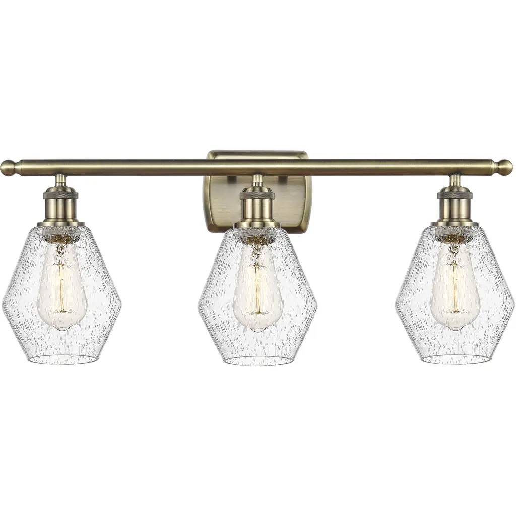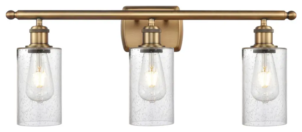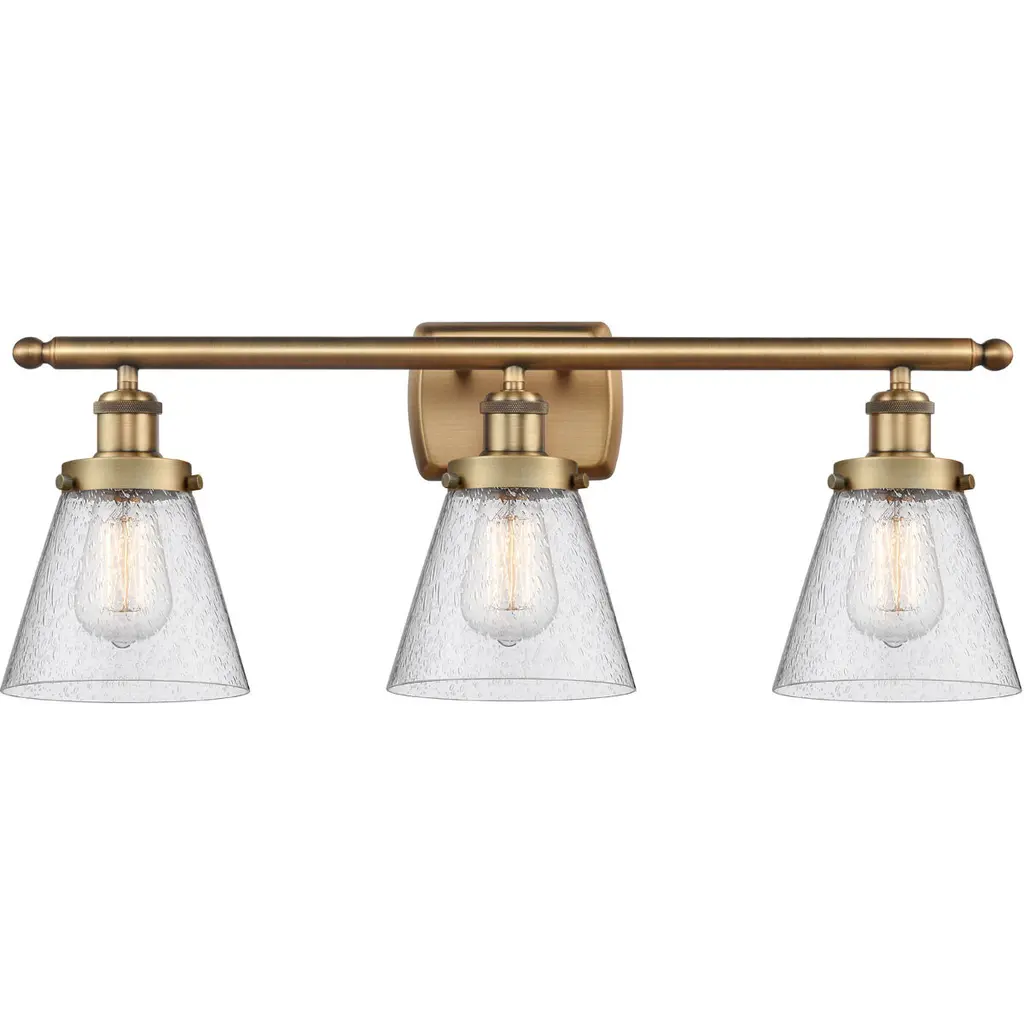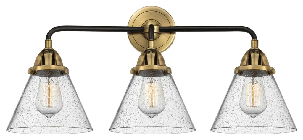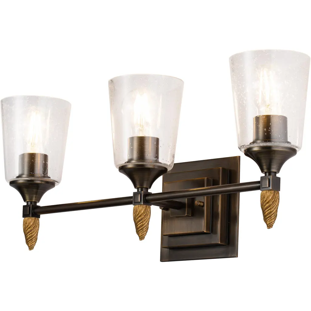 Drawing inspiration from a classic design, this black and gold 3-light vanity light is the perfect pick for any contemporary or traditional space. This Felice design showcases a simple, rectangular 5" square backplate, dome shaped glass shade, and a decorative unique acorn-shaped gold finial. Easily installed over your mirror, this two-light sconce is suitable for damp spaces, and is finished in a beautiful matte black.