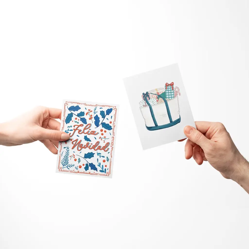 Feliz Navidad, Tote With Presents, Cheers To A Bright New World Winter/holiday/christmas Greeting Card Pack Sets (3 Ct, Assorted) By Ramus & Co