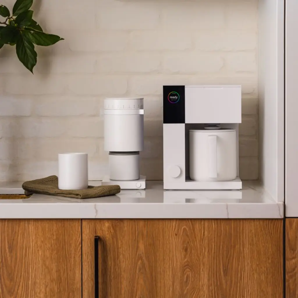 The quality of pour-over coffee, the convenience of drip. This sleek coffee maker from Fellow precisely controls the brewing process to create impeccable coffee automatically. Whether you prefer to make one cup or a whole pot, Aiden dials in the most important variables for brewing quality pour-over coffeeto-the-degree temperature control, precise coffee-to-water ratios and a built-in bloom cycle. You can also opt to dial in your own preferences. Create custom profiles with precise control of eight brewing parameters, or choose Instant Brew Mode for great-tasting coffee at the press of a button. Or use the app to schedule brewing so your coffee is ready precisely when you are. Clean-lined and modern in white with a thermal carafe that keeps coffee warm for hours, the machine pairs beautifully with our other Fellow coffee essentials.