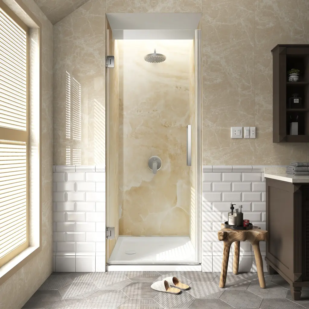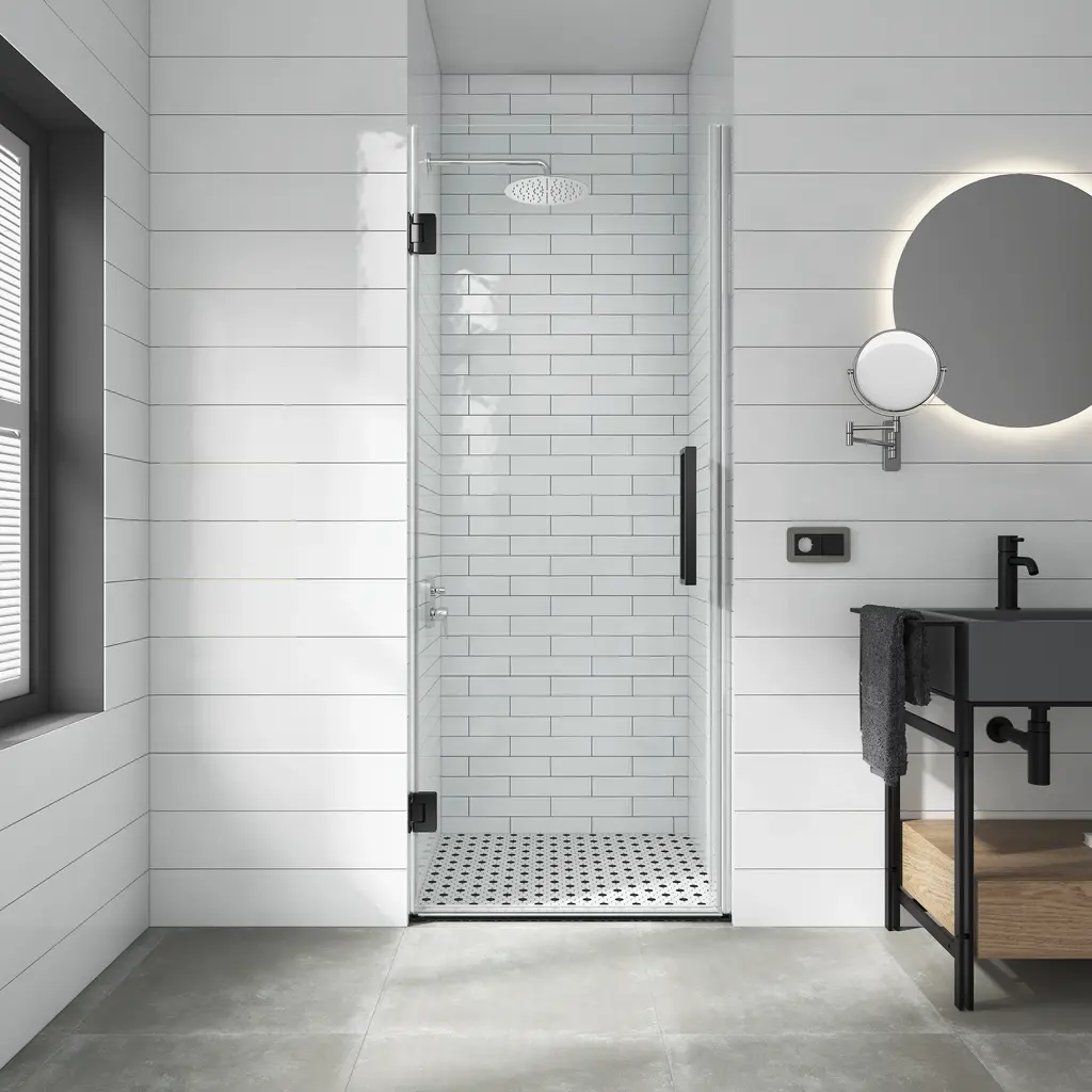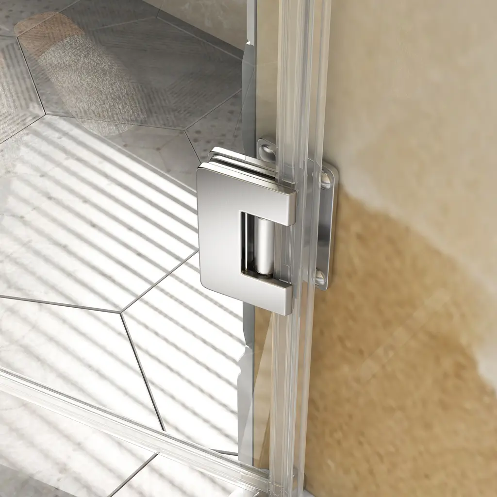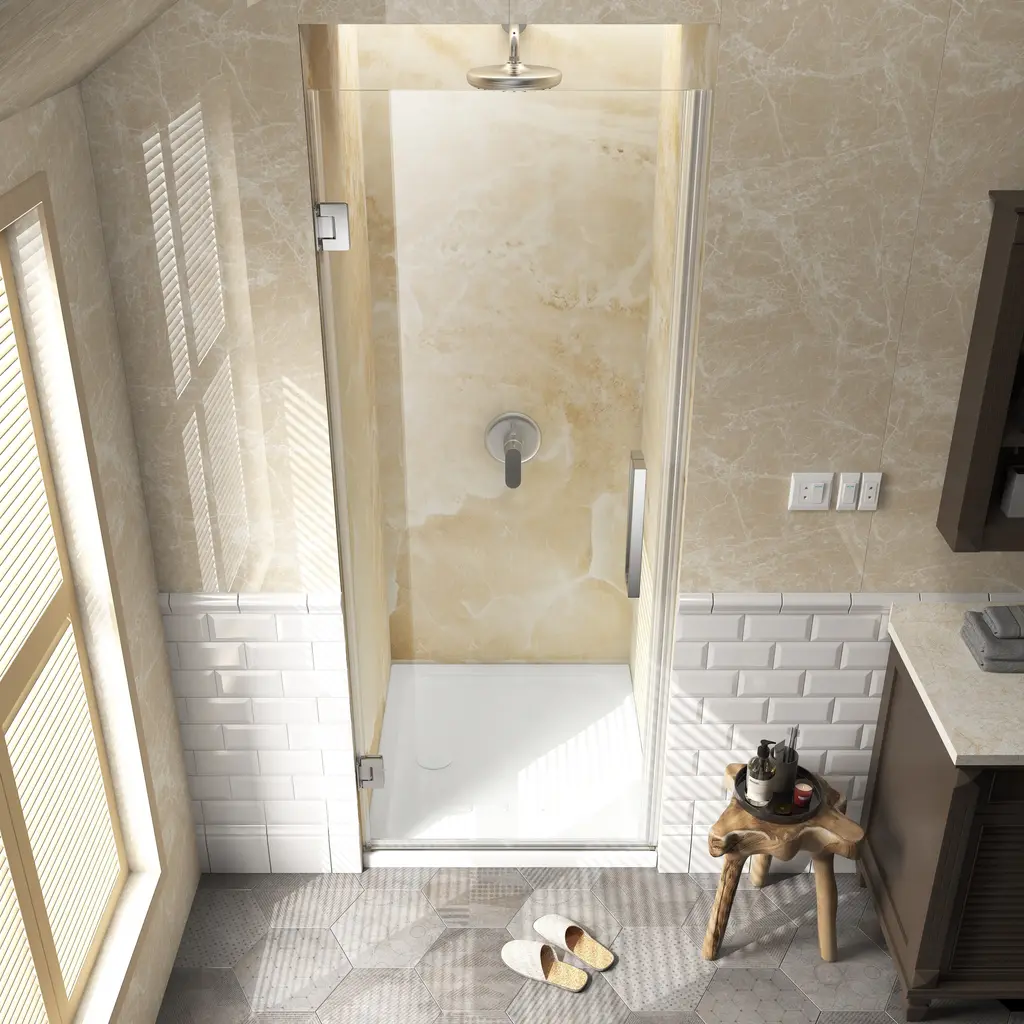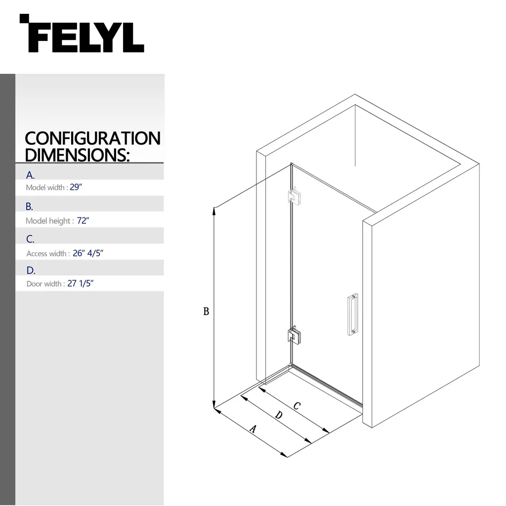 The hinged frameless shower door featuring a clear finish is stylish and eye-catching to enhance your shower area. Shower glass treated with protective coating is made to repel water, and prevent glass panels against the buildup of hard water and stain. Back-to-back handles in clean lines design complete the look is easy to access, the shower door designed in a good look and made for low maintenance is a great addition to your bathroom. FeaturesProduct Details Dimension