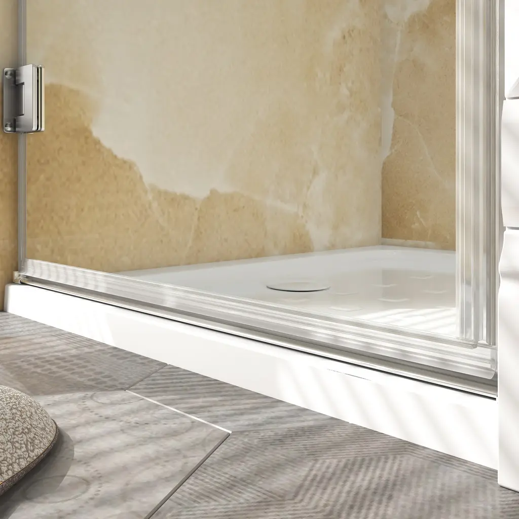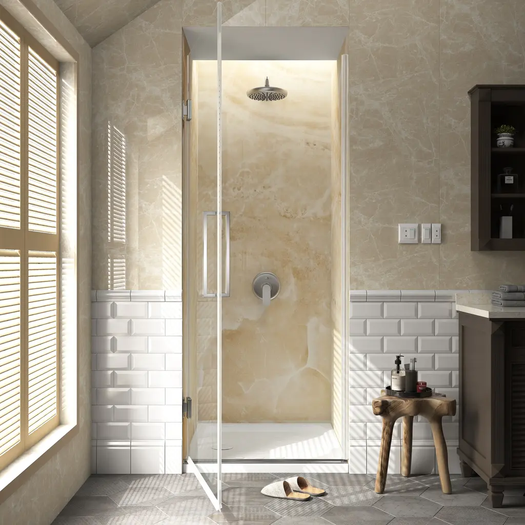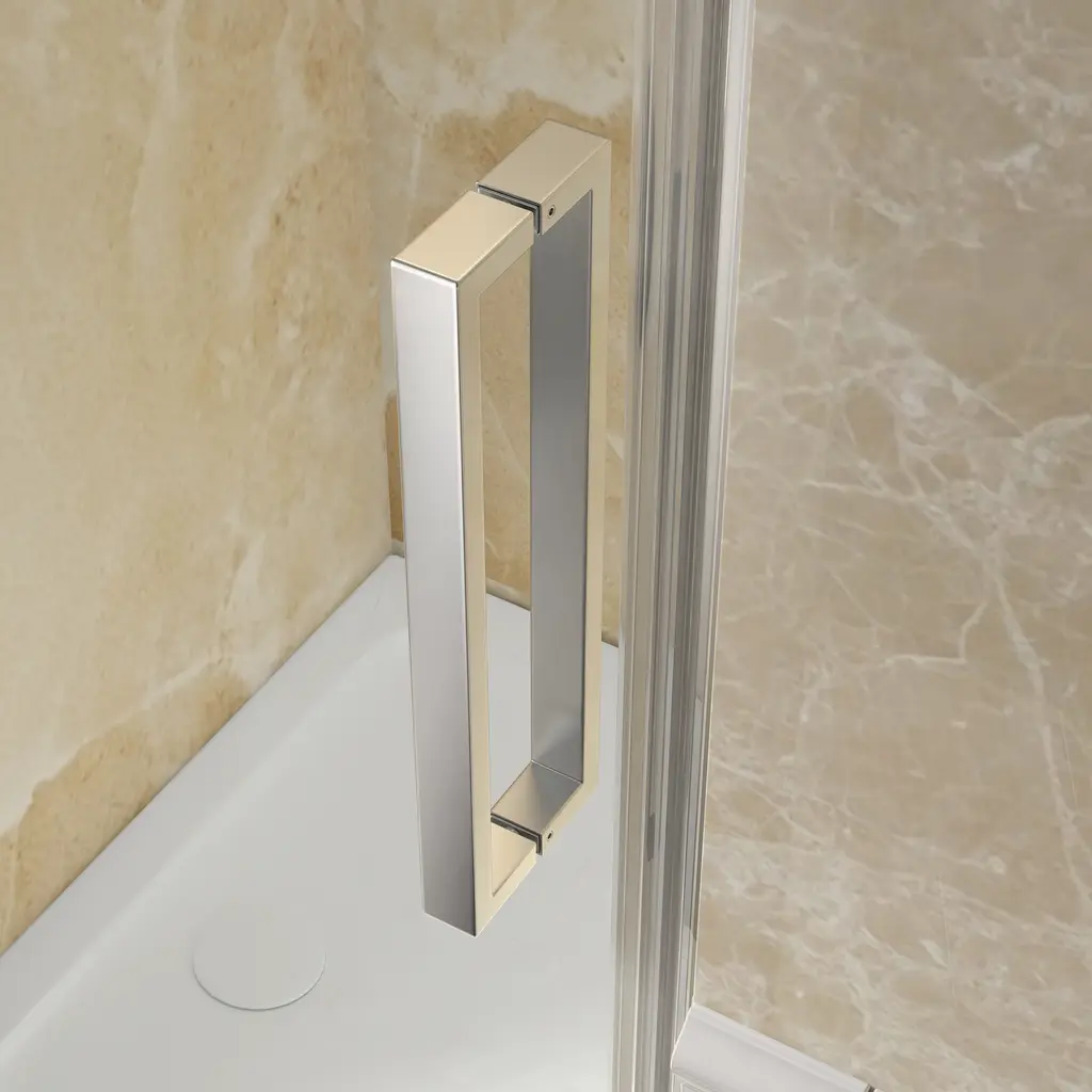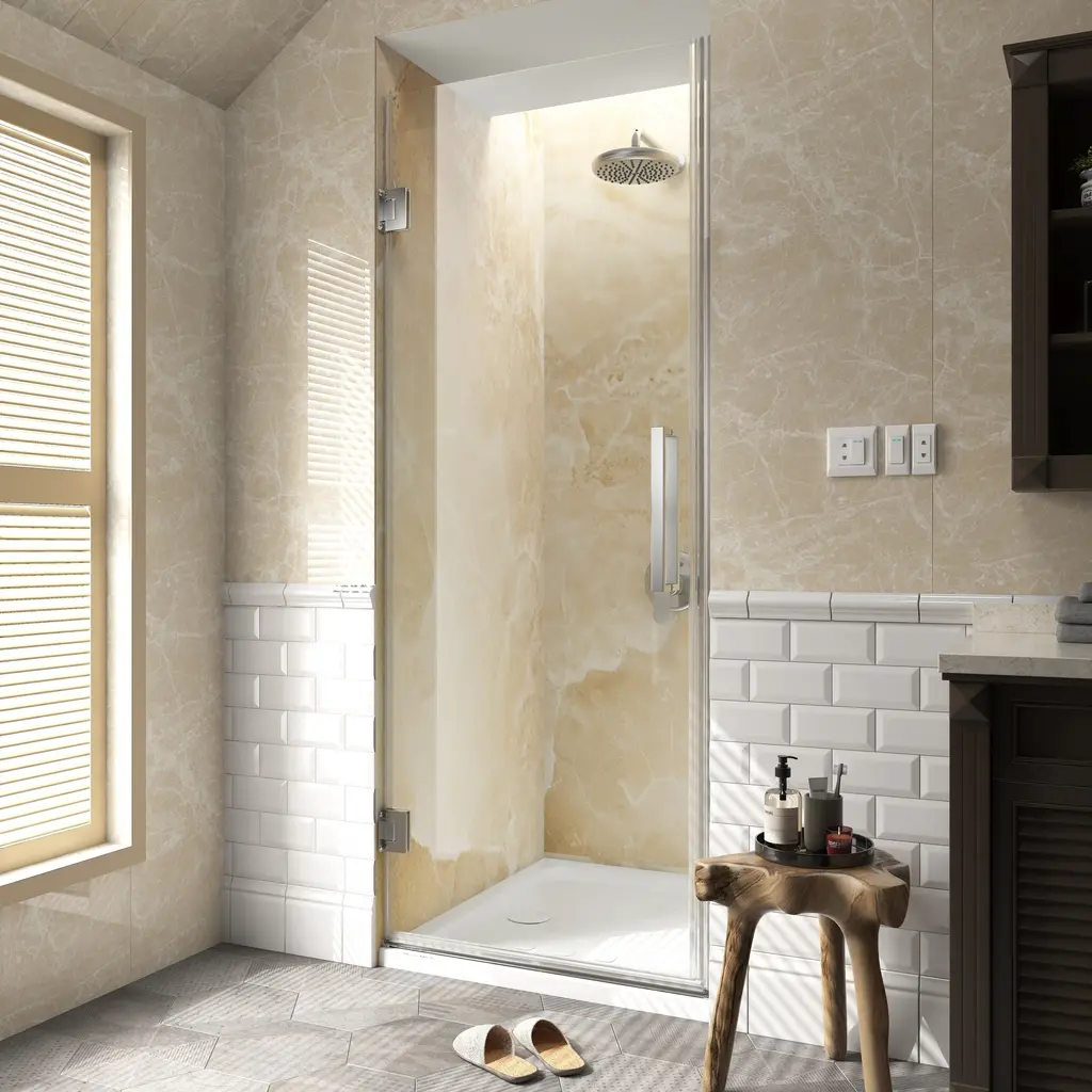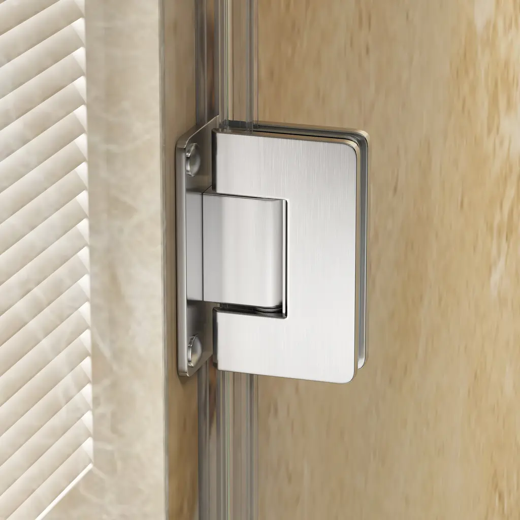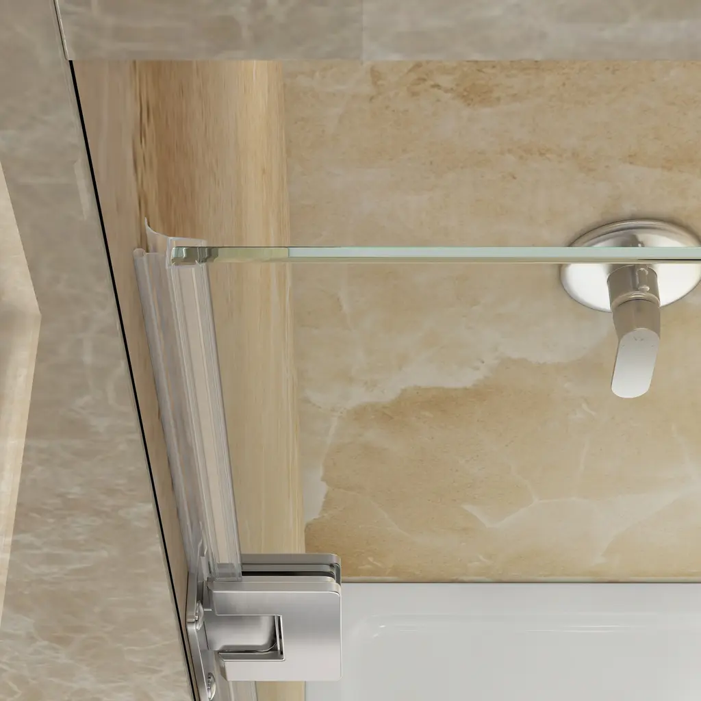 The hinged frameless shower door featuring a clear finish is stylish and eye-catching to enhance your shower area. Shower glass treated with protective coating is made to repel water, and prevent glass panels against the buildup of hard water and stain. Back-to-back handles in clean lines design complete the look is easy to access, the shower door designed in a good look and made for low maintenance is a great addition to your bathroom. FeaturesProduct Details Dimension