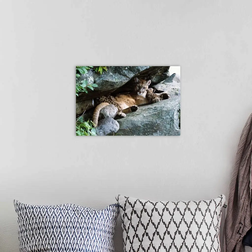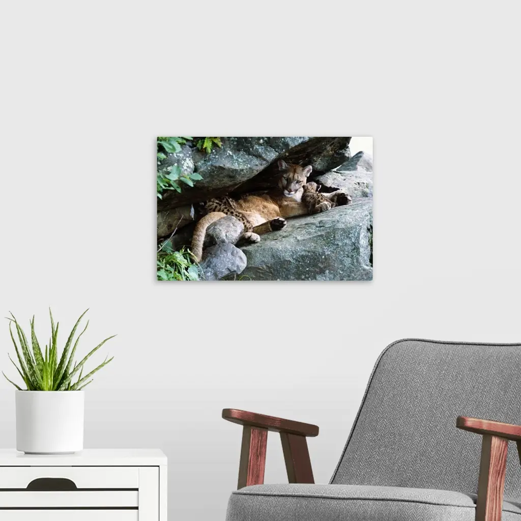Female cougar lying under rock overhang with cubs, Minnesota wall art for home and office decor. Discover canvas art prints, photos, mural, big canvas art and framed wall art in GreatBigCanvas.com's varied collections.