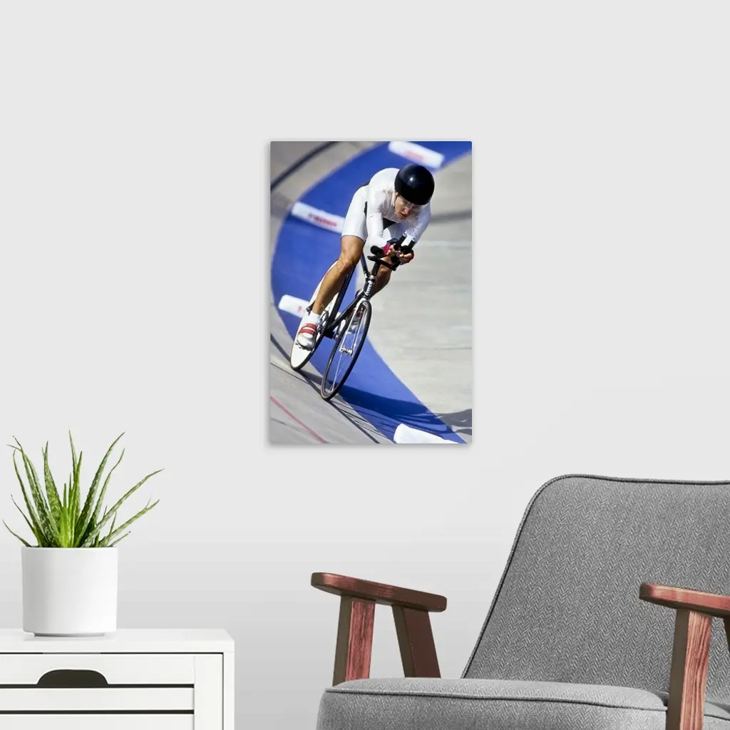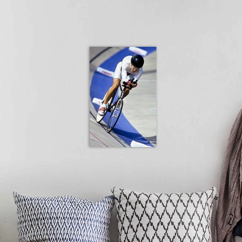 Female cyclist racing on the velodrome track wall art for home and office decor. Discover canvas art prints, photos, mural, big canvas art and framed wall art in GreatBigCanvas.com's varied collections.