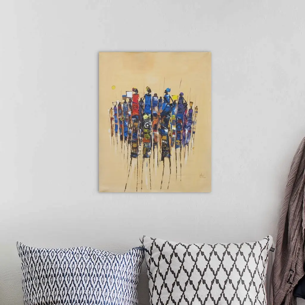 The effort the women at the market make is admirable, confides Francis Amoah. They also inspire him to paint about them, all clustered together, carrying their goods on their heads and their babies on their backs as they work.