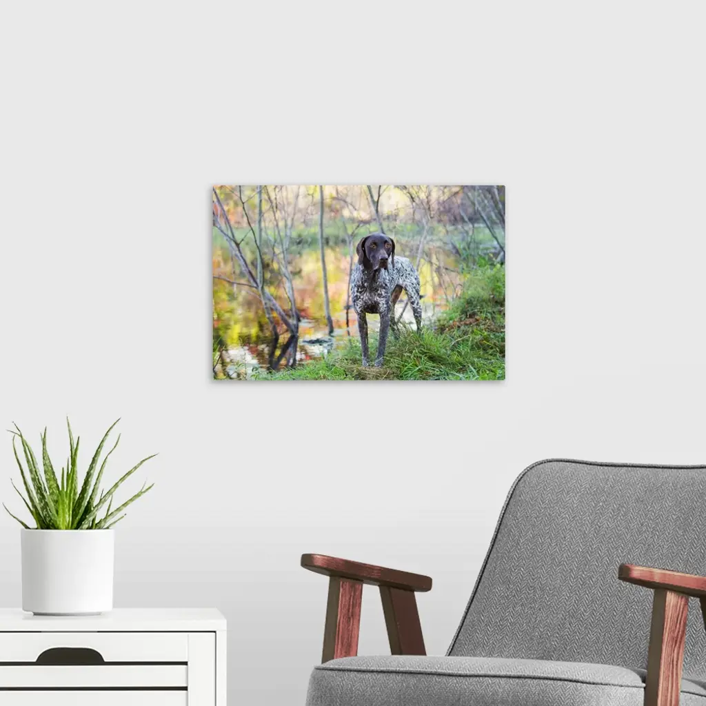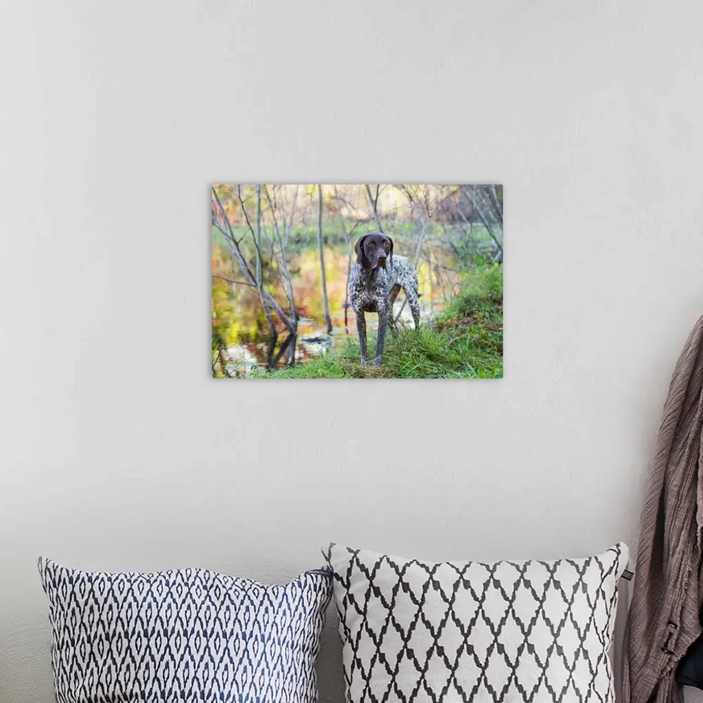 Female German Shorthair Pointer in early autumn vegetation, Canterbury, Connecticut wall art for home and office decor. Discover canvas art prints, photos, mural, big canvas art and framed wall art in GreatBigCanvas.com's varied collections.