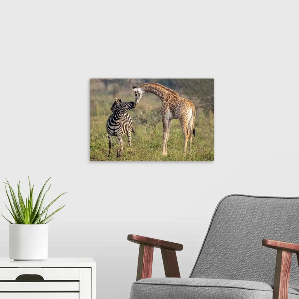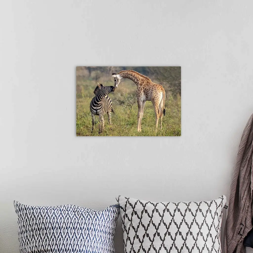 Female Zebra Interacting With Giraffe Calf, Zimanga Private Game Reserve, South Africa