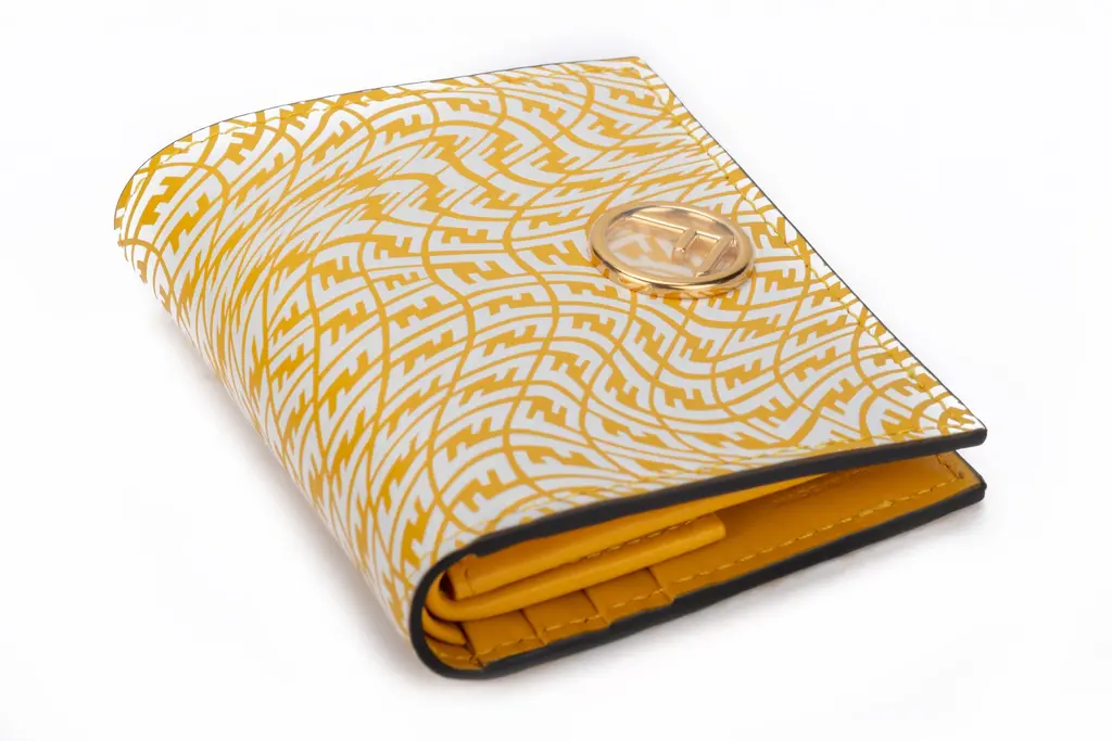 Fendi new in box small wallet liberty patent vertigo pattern. Yellow and white color combo with hardware in gold .Box and original dustcover.