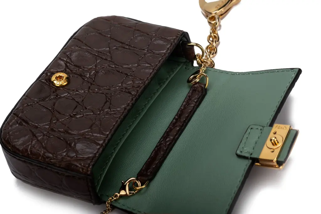 Fendi brown cayman nano baguette with gold tone hardware. 17 19,5 inches detachable shoulder strap. Can be worn as a charms also or a belt bag. Cites declaration included. Box, booklet and original dustcover.