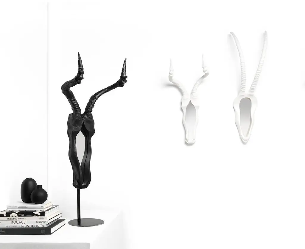 Fendo is a hybrid project signed by Ctrlzak for Mogg. Two mirrors in resin, available in black or white colored finish, which reproduce two extinguished mammals' head. Available also in the table version by adding the pedestal.This particular mirror is something irripetible, thought for those who search a very personal style. The two sculptural objects are made with a faithful design, with the reconstruction of perfect horns. The idea is remember the past saving the image of ancient animals.