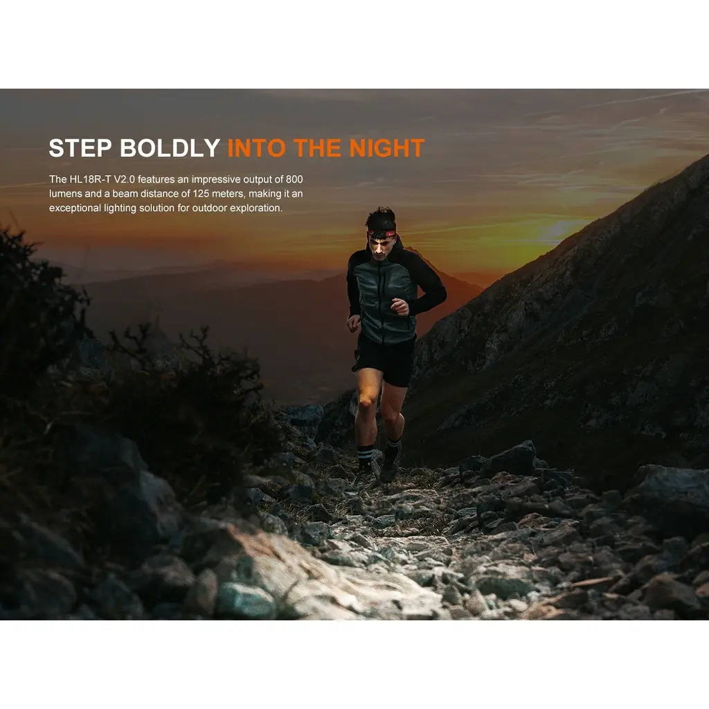 The Fenix HL18R-T V2.0 is a lightweight headlamp designed for trail running, featuring white light and warm white beams that can deliver up to 800 lumens of brightness and a throw of up to 136 yards. Compared to its predecessor, the HL18R-T V2.0 is brighter, throws farther, features more light outputs, and more. The white light mode offers clear visibility of road conditions from a distance, while the warm white light reduces eye strain and ensures clear vision in rough weather conditions. With 8 brightness levels across two beam modes plus two Red Light modes, the HL18R-T V2.0 provides remarkable versatility to meet various outdoor demands, making it an ideal companion for activities such as trail running, jogging, hiking, and camping.Powering the HL18R-T V2.0 is flexible as it can operate with the included rechargeable battery or three commonly available AAA batteries. When fully charged the HL18R-T V2.0 can provide up to 160 hours on its lowest setting. When it's time to recharge, the built-in USB-C port makes it easy, fully charging the light in just 3 hours. A power indicator lets you know when it's time to recharge. Weighing just 3.63 oz, the headlamp is lightweight and comfortable to wear for extended periods with its SPORT headband, making it ideal for long work shifts or outdoor adventures. Its easy-to-use sliding lock switch prevents accidental activation. It is also rated IP66 waterproof and can withstand drops up to 1 meter, making it tough and durable in any environment.