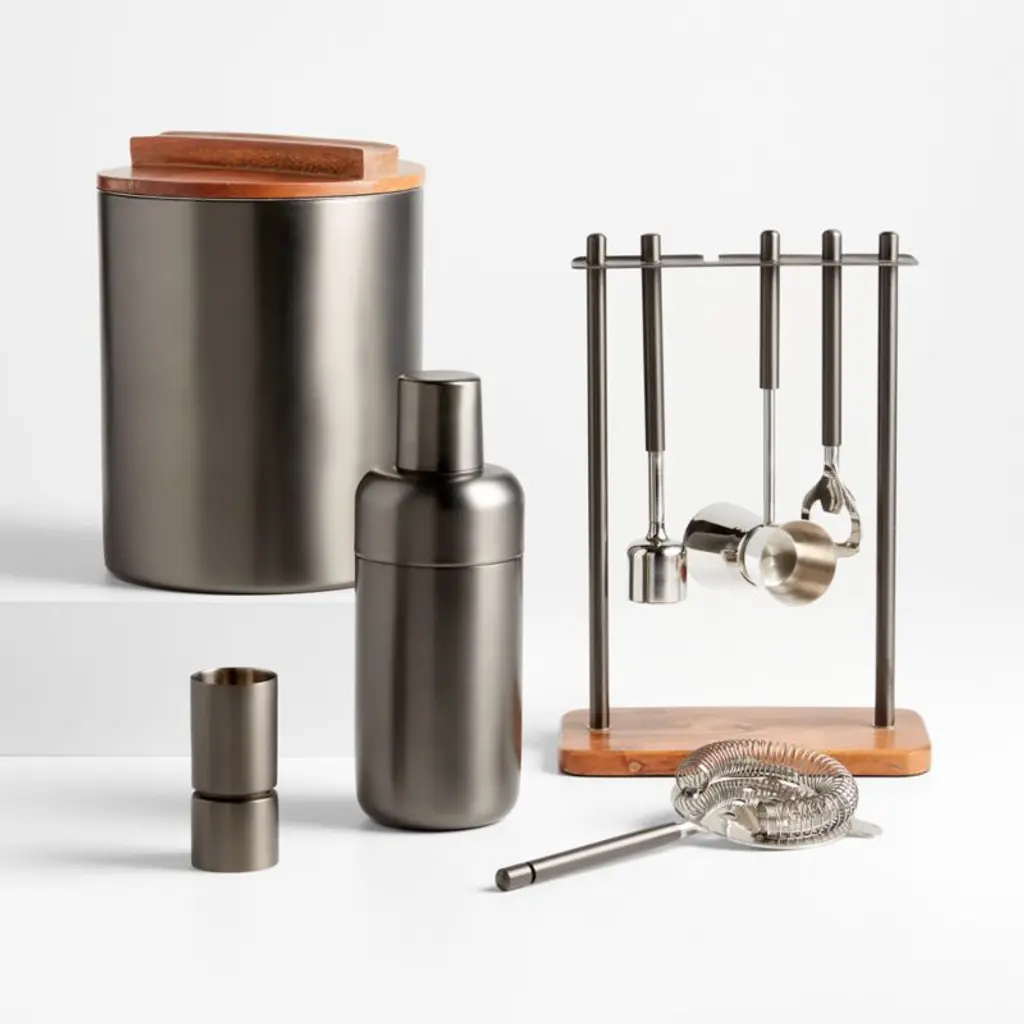 Our Fenton bar tool set translates simple lines and straightforward function into a sleek, contemporary design with mirror-finished heads and matte graphite handles. Set of jigger, bottle opener, muddler and strainer hang from a graphite and acacia wood stand for easy access.