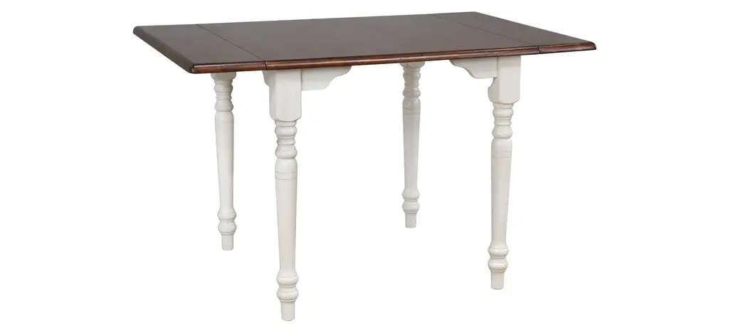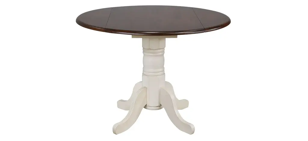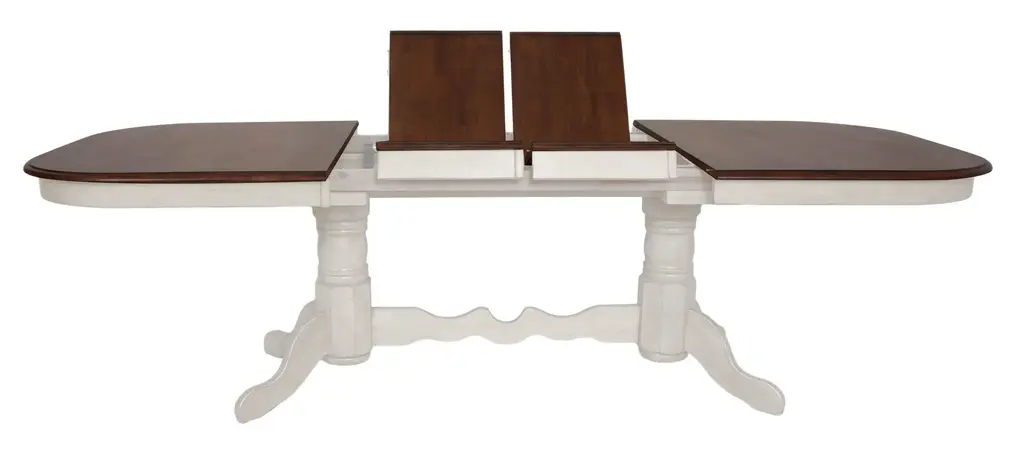 Invite a touch of farmhouse chic, British Caribbean and traditional style into your home with this Fenway double pedestal dining table with leaves. This two toned white and medium wood table with French provincial charm is the ideal choice for smaller spaces, it easily expands for larger gatherings with two self storing 14 inch leaves. Equally appropriate for your kitchen or dining room, memories are sure to be made when family and friends gather around this versatile dining table in your stylish and comfortable dining chairs. Pair with additional dining furniture piece to create your perfect space.