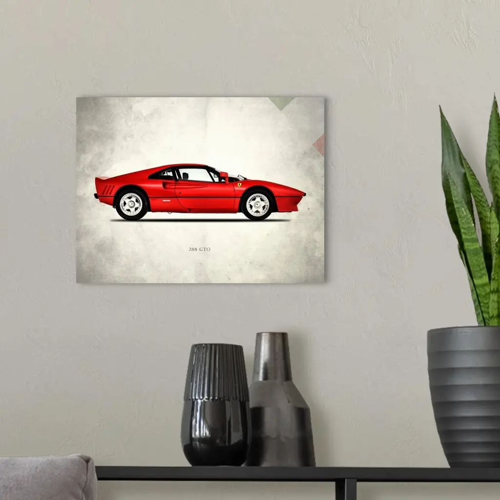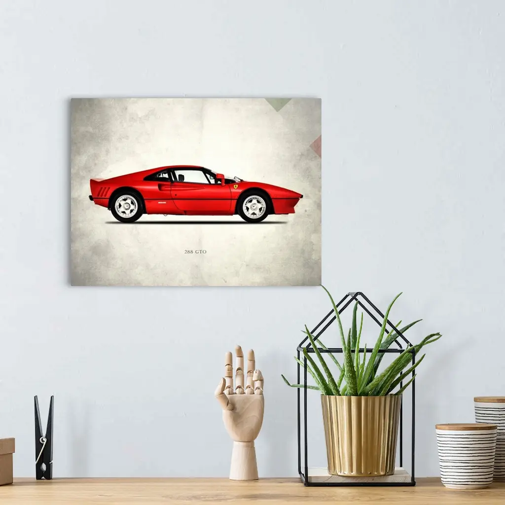 Photograph of a red Ferrari 288 printed on a distressed white and gray background with part of the Italian flag in the top right corner.