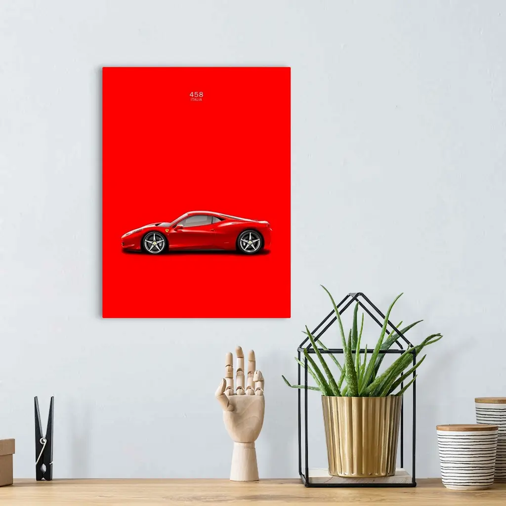 Photograph of a bright red Ferrari 458 Italia printed on a red background