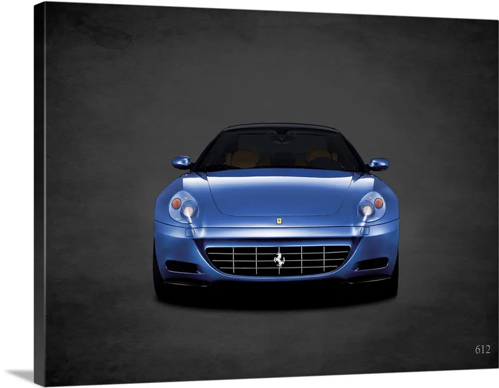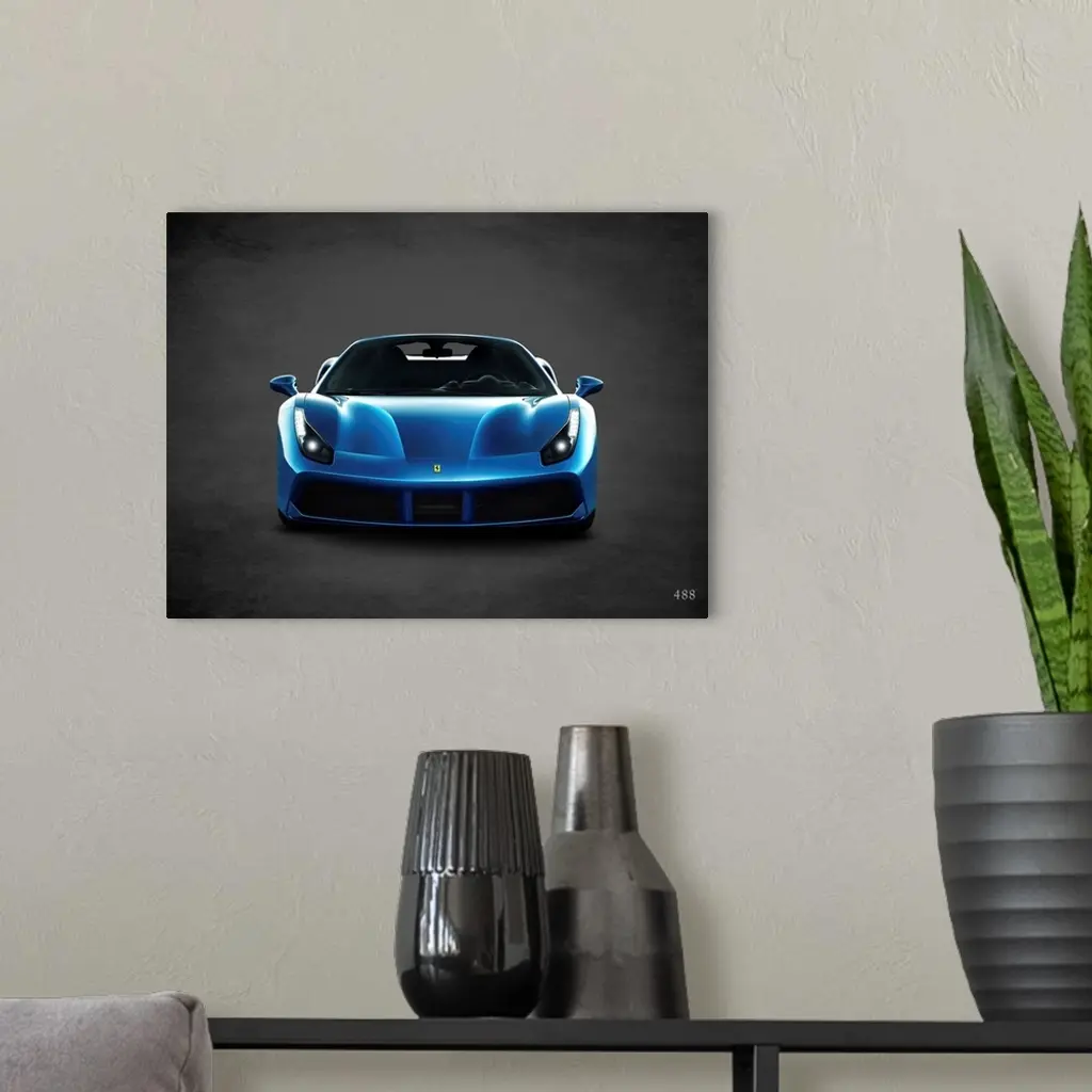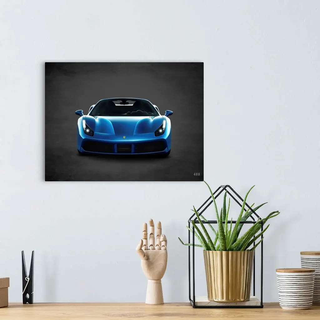 Photograph of a blue Ferrari 488 printed on a black background with a dark vignette.