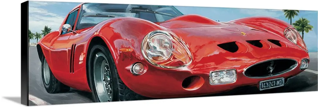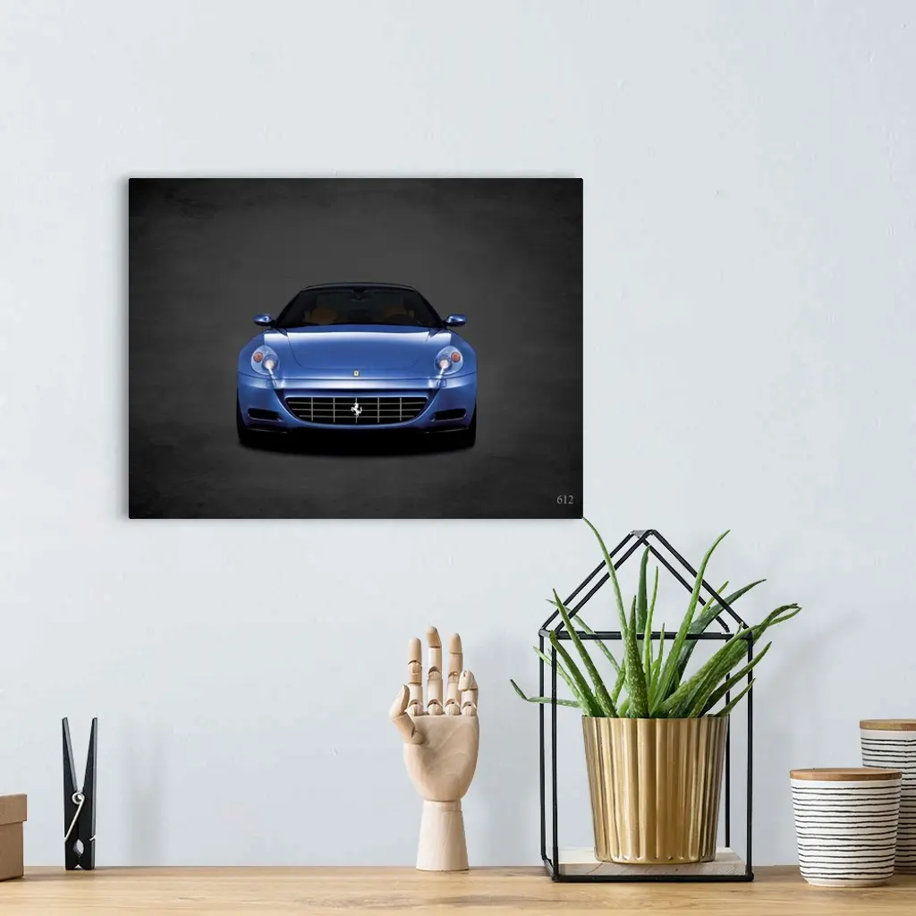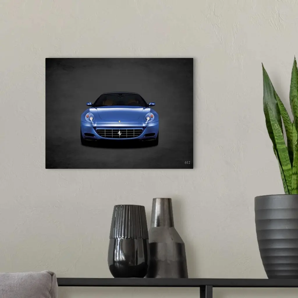 Photograph of a blue Ferrari 612 printed on a black background with a dark vignette.
