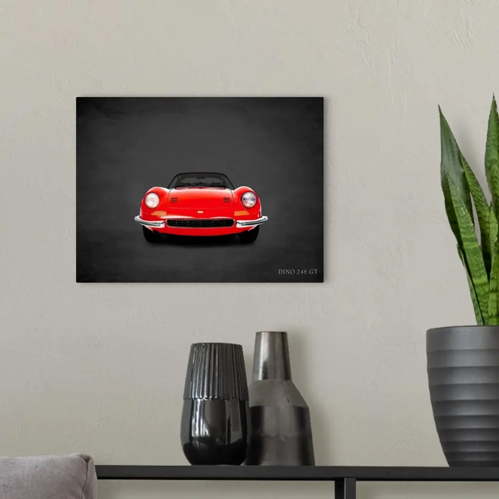 Photograph of a red 1969 Ferrari Dino 246GT printed on a black background with a dark vignette.