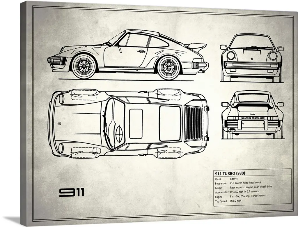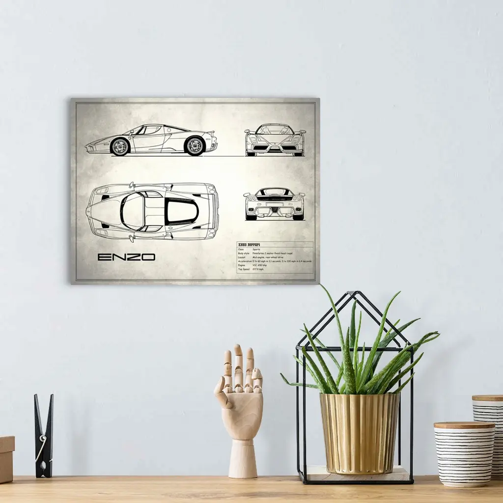Antique style blueprint diagram of a Ferrari Enzo printed on a weathered white and gray background.