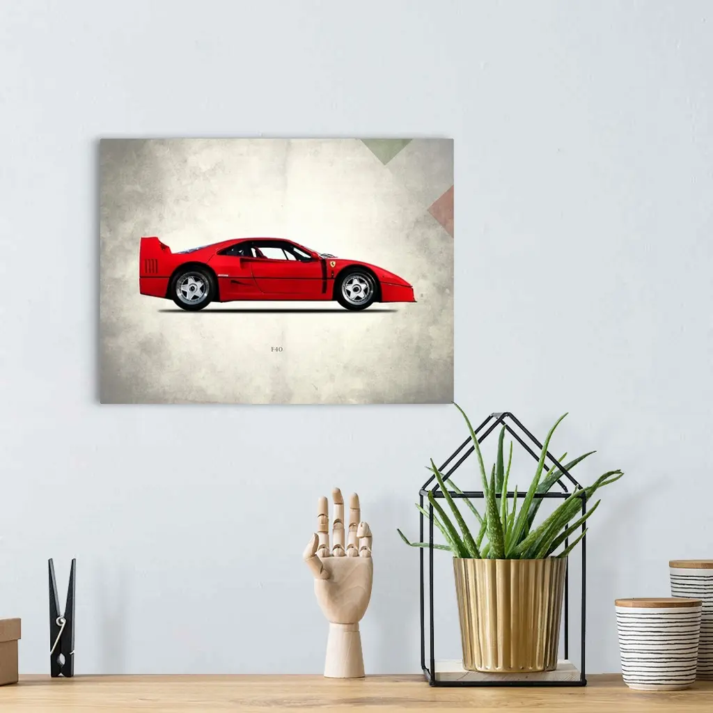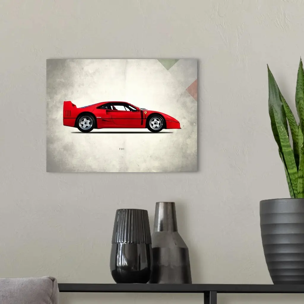 Photograph of a red Ferrari F40 Berlinette 1992 printed on a distressed white and gray background with part of the Italian flag in the top right corner.