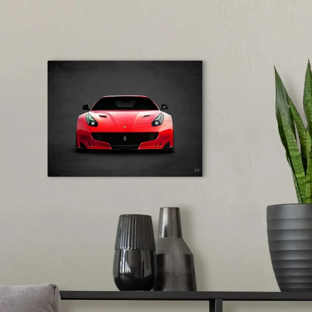 Photograph of a red Ferrari FF printed on a black background with a dark vignette.