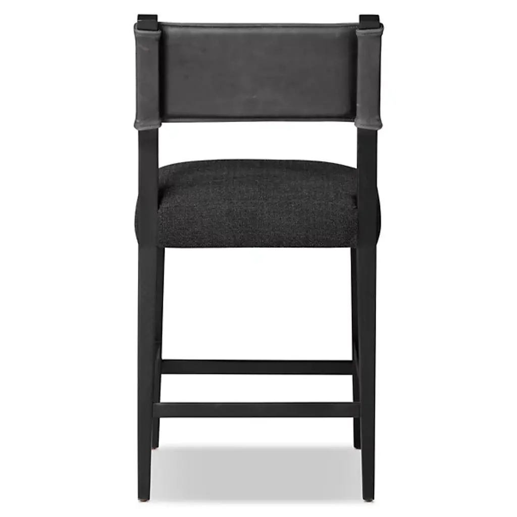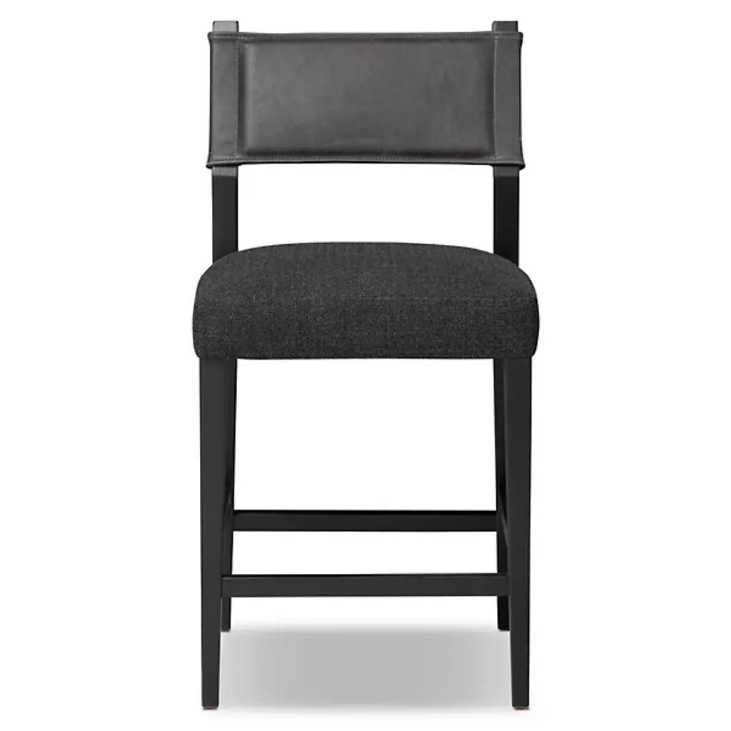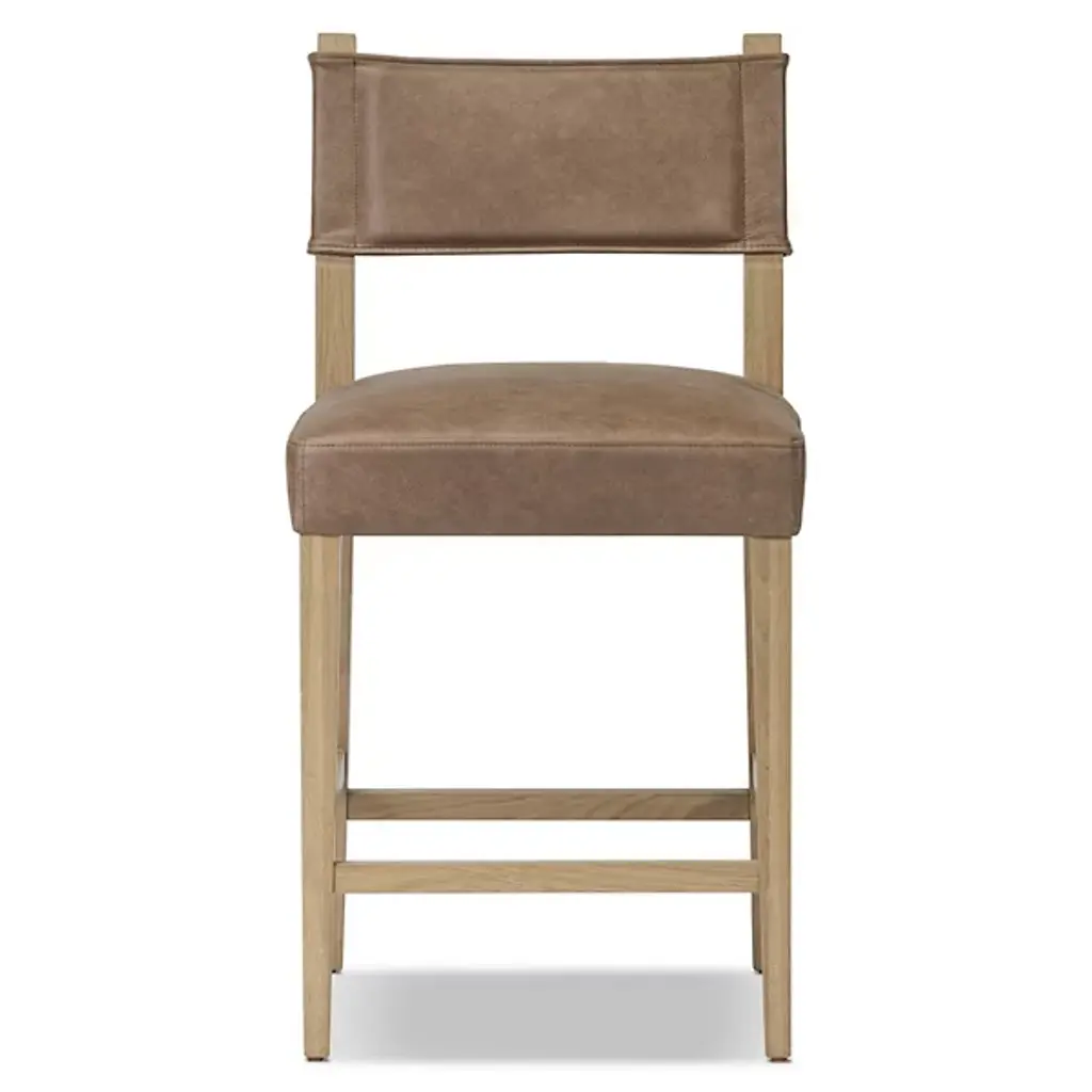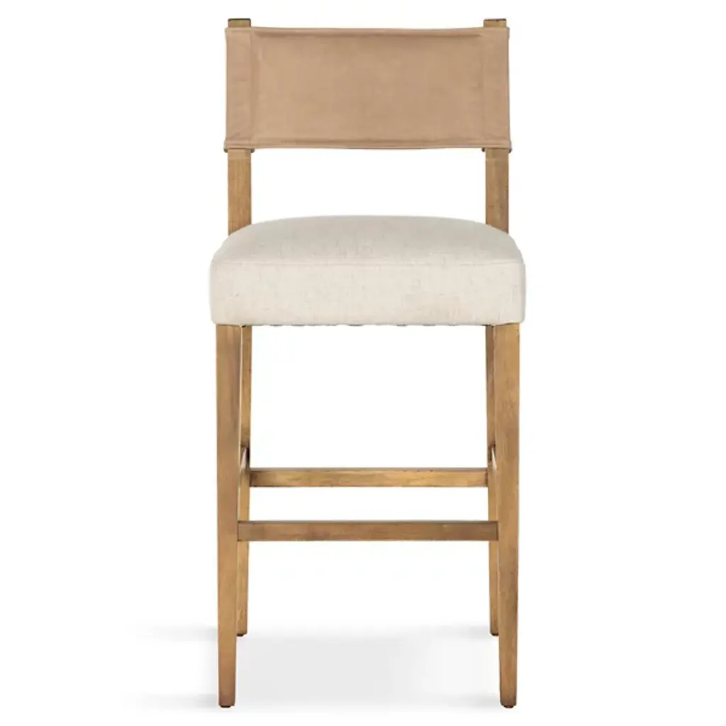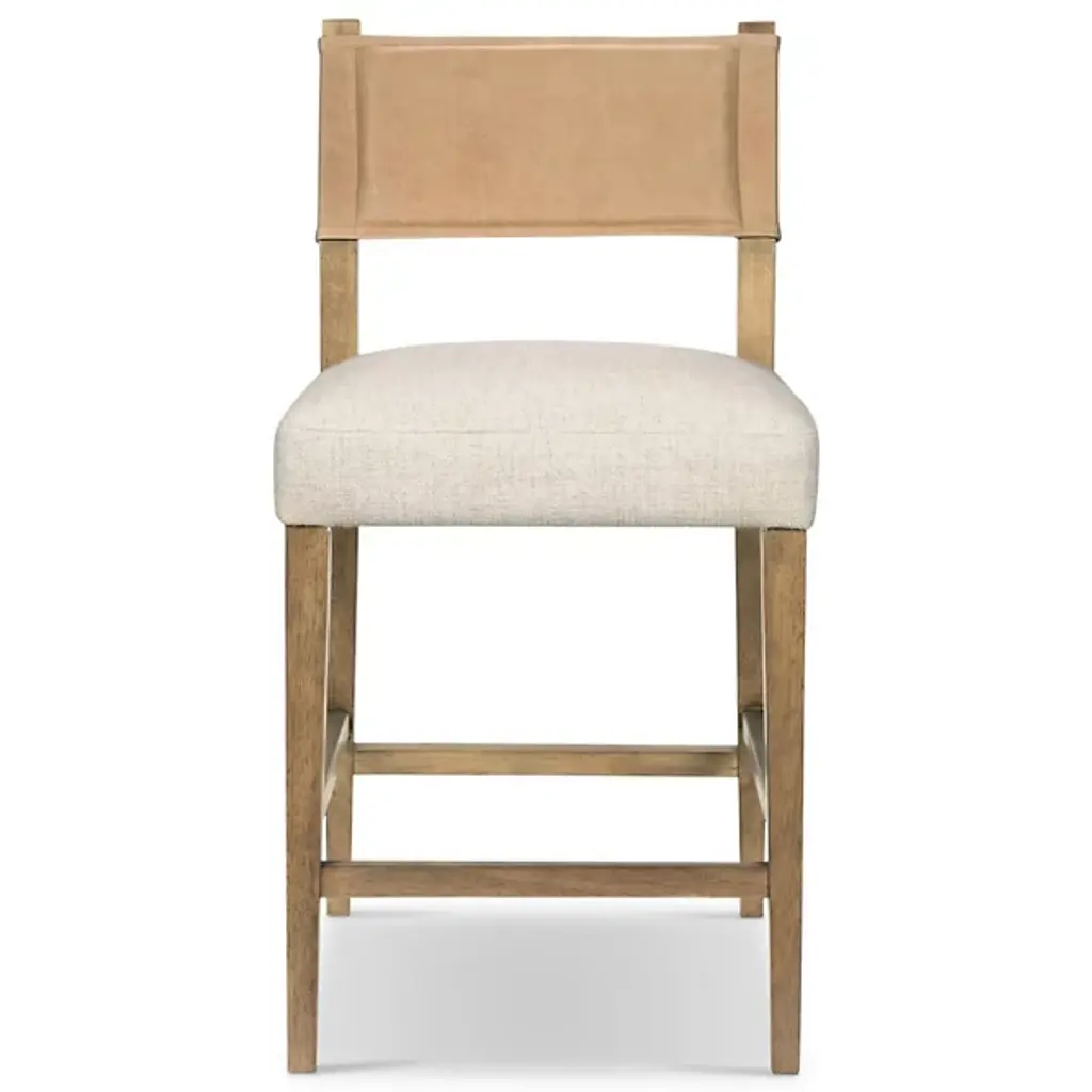 The Ferris Bar/Counter Stool from Four Hands showcases the finest in mixed materials, featuring a burnished parawood frame that encases squared seating in high-performance beige fabric. The back is upholstered in lightly waxed beige top-grain leather, making it a standout piece perfect for the head of the table. Designed with durability, the performance fabrics are crafted to withstand spills, stains, and heavy use, ensuring long-lasting comfort and exceptional resilience, making this chair stylish and practical.