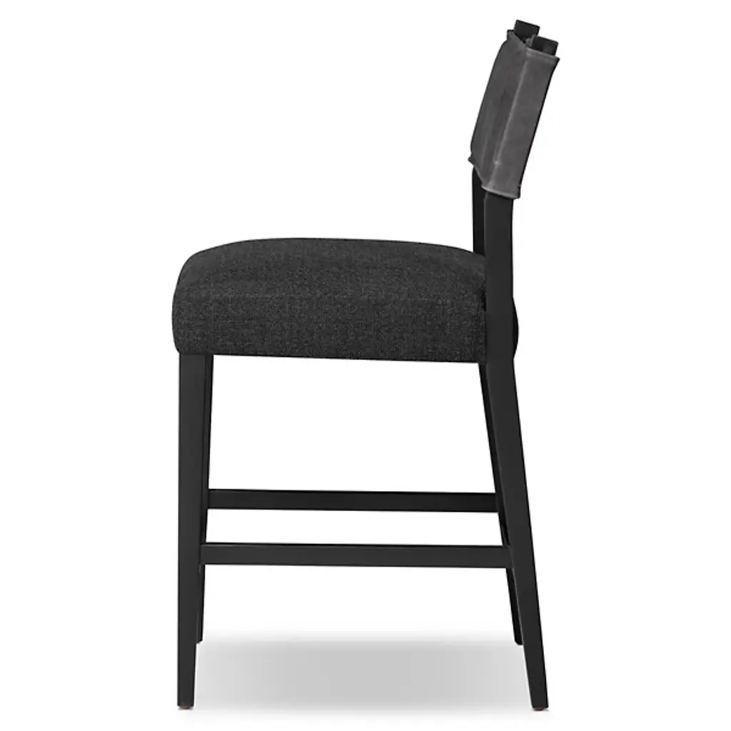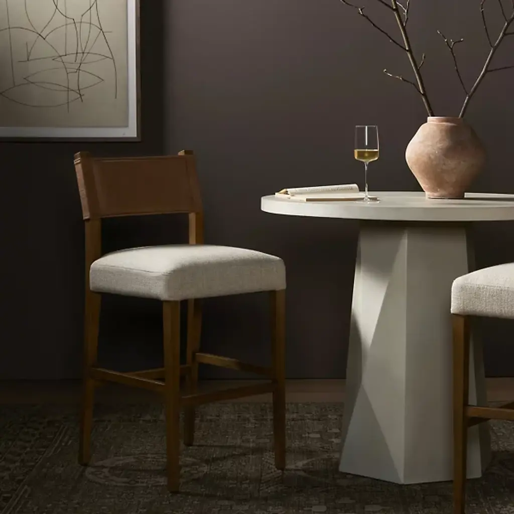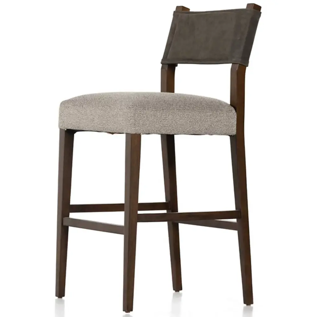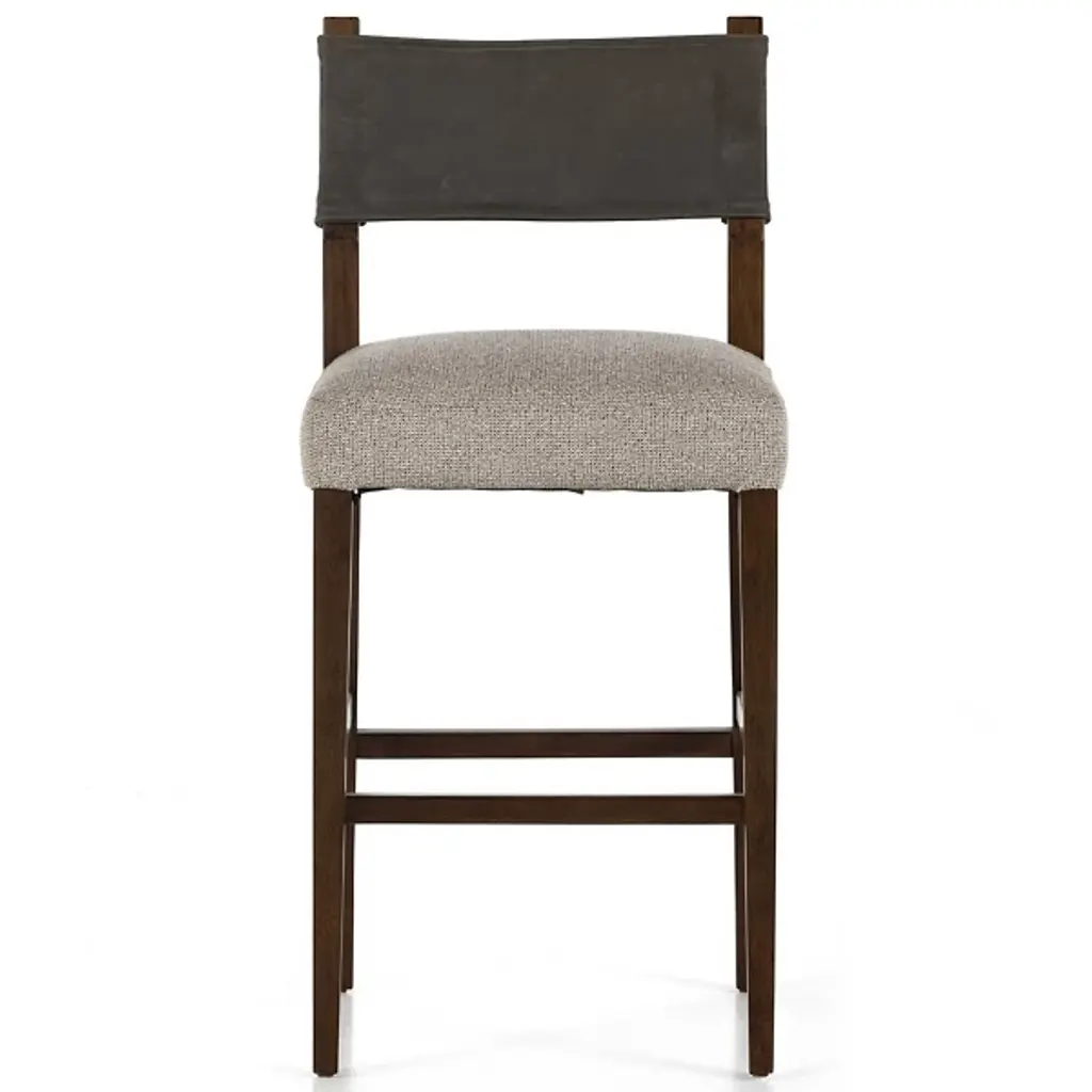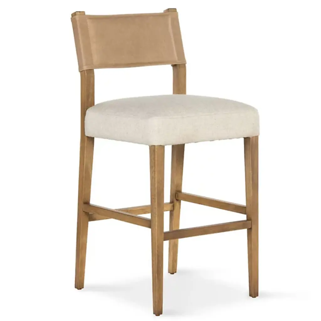 The Ferris Bar/Counter Stool from Four Hands showcases the finest in mixed materials, featuring a burnished parawood frame that encases squared seating in high-performance beige fabric. The back is upholstered in lightly waxed beige top-grain leather, making it a standout piece perfect for the head of the table. Designed with durability, the performance fabrics are crafted to withstand spills, stains, and heavy use, ensuring long-lasting comfort and exceptional resilience, making this chair stylish and practical.