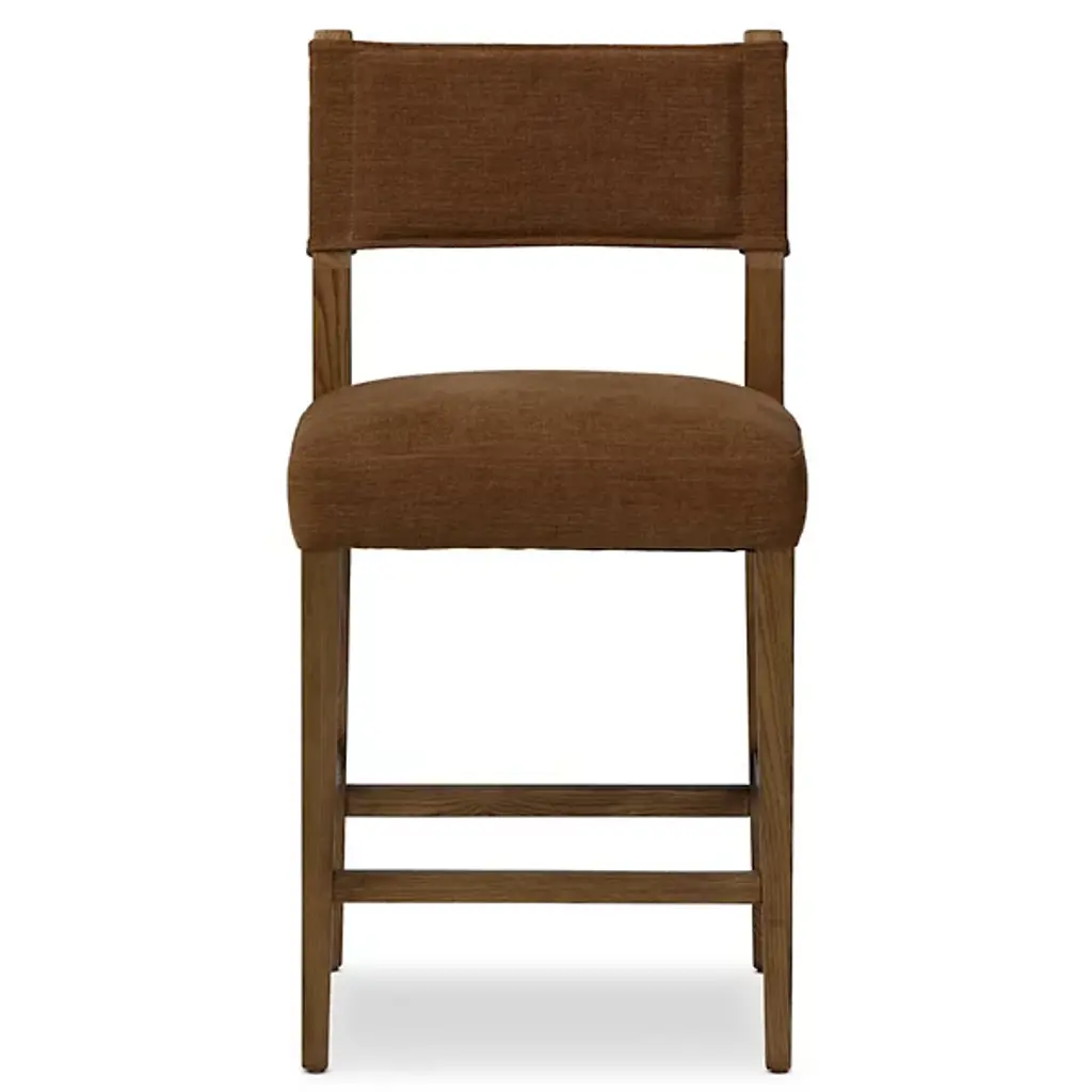The Ferris Bar/Counter Stool from Four Hands showcases the finest in mixed materials, featuring a burnished parawood frame that encases squared seating in high-performance beige fabric. The back is upholstered in lightly waxed beige top-grain leather, making it a standout piece perfect for the head of the table. Designed with durability, the performance fabrics are crafted to withstand spills, stains, and heavy use, ensuring long-lasting comfort and exceptional resilience, making this chair stylish and practical.