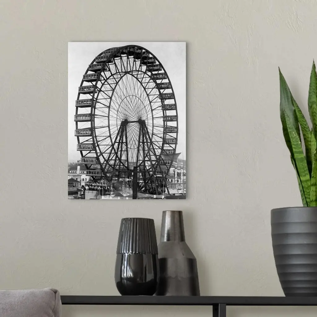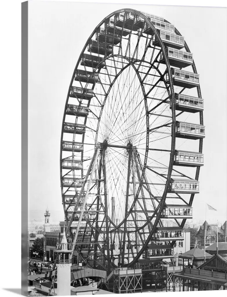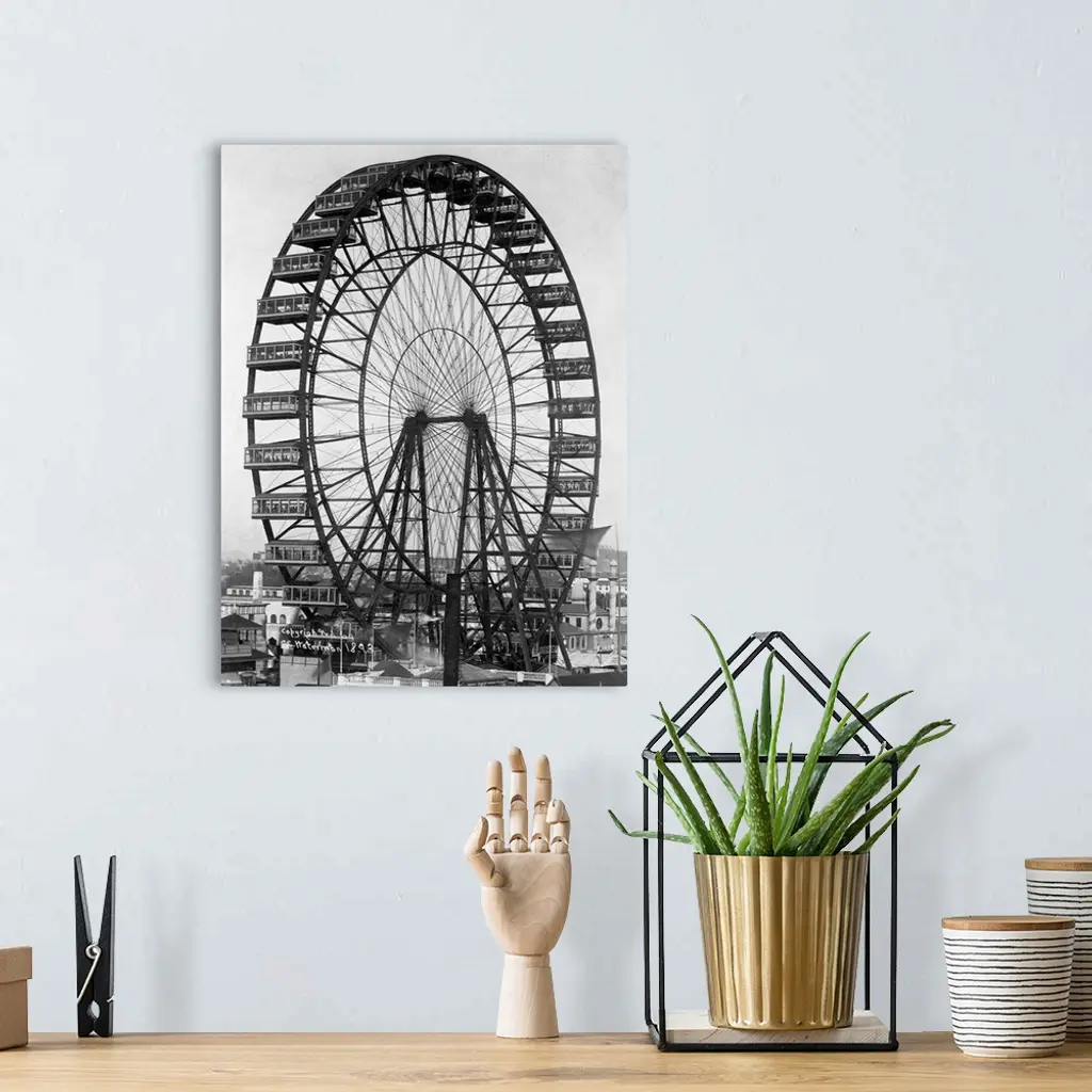 The ferris wheel turns on the World's Columbian Exposition fairgrounds in 1893. Chicago, Illinois, USA.